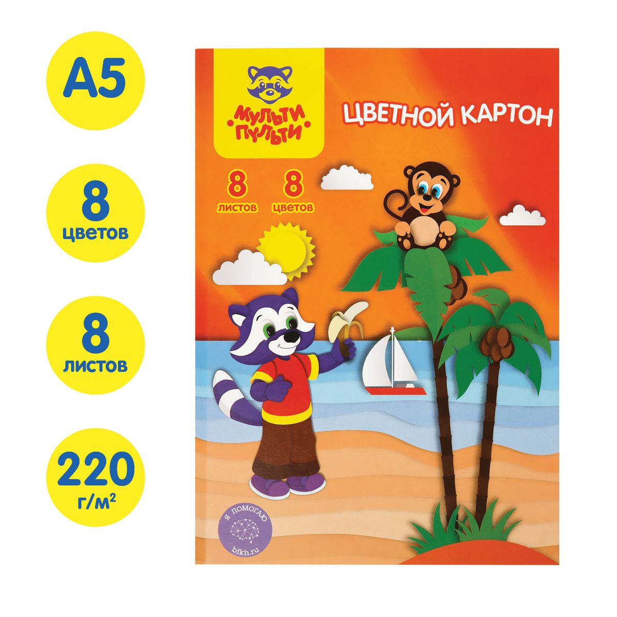 Картон цветной А5, Мульти-Пульти, 8л., 8цв., немелованный, в папке, "Приключения Енота"