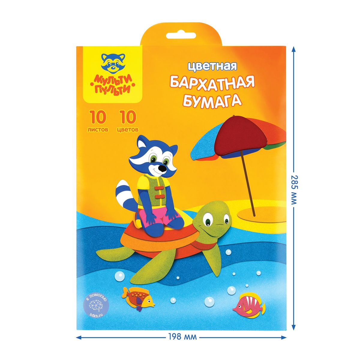 Подробности и характеристики: Бумага формата А4 имеет плотность 80 г/м² и бархатную поверхность. Окраска односторонняя, набор включает 10 цветов. В пачке 10 листов, упаковка защищает бумагу от повреждений. Артикул и штрих-код указаны на упаковке, страна производства - Россия.