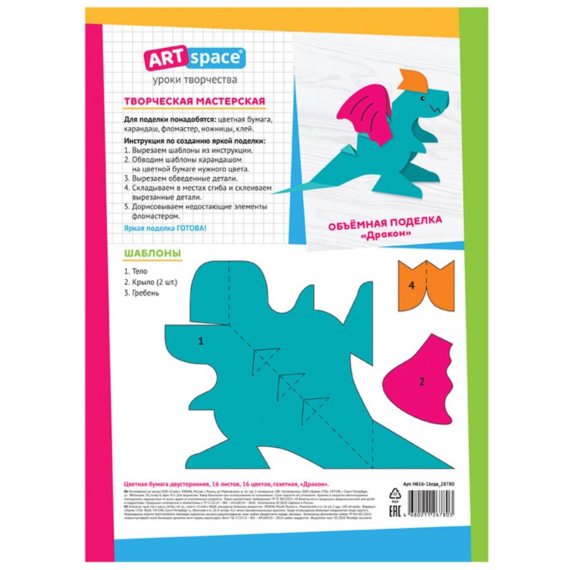 Подробности и характеристики: Цветная бумага ArtSpace Dragon представлена в формате А4 (210x297 мм) и имеет плотность 16 г/м². Набор включает 16 листов, каждый из которых окрашен с двух сторон в 16 разных цветов. Бумага упакована в пачку, артикул и страна производства указаны на упаковке.