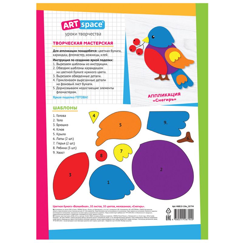 Цветная бумага мелованная А4, ArtSpace, 10л., 10цв., "Волшебная. Снегирь"