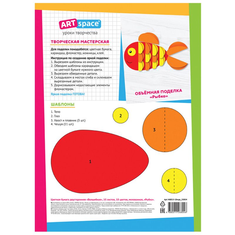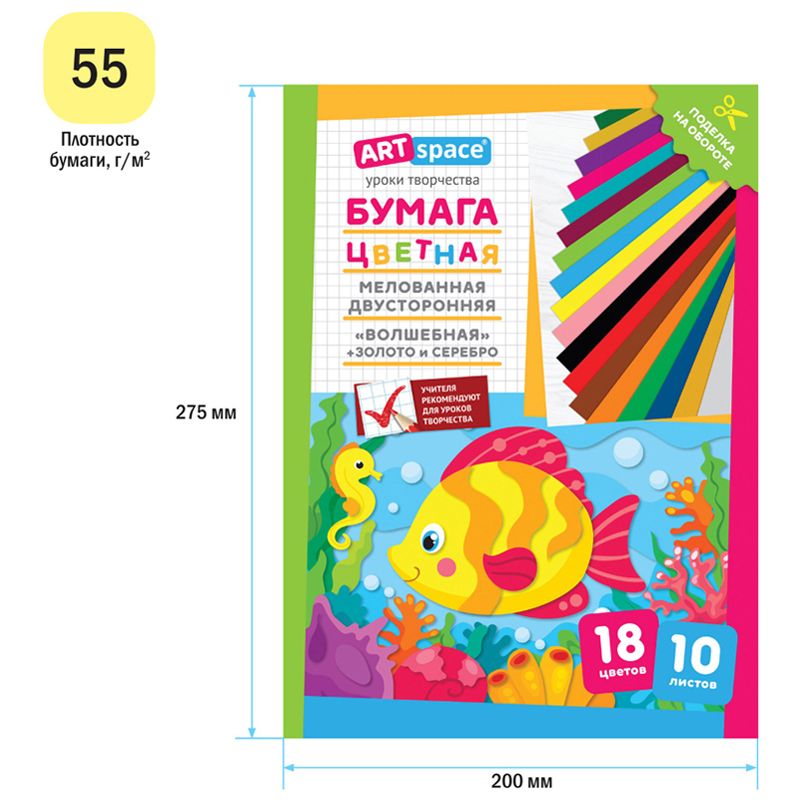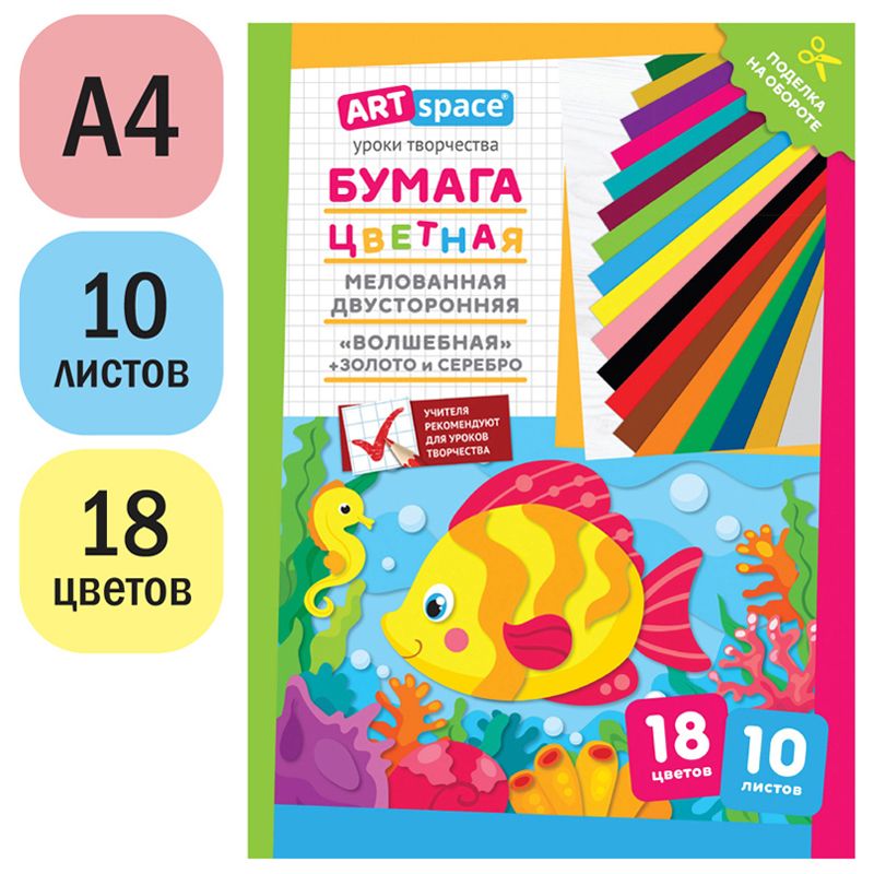 Цветная бумага мелованная А4, ArtSpace, двустор., 10л., 18цв., "Волшебная. Рыбка"