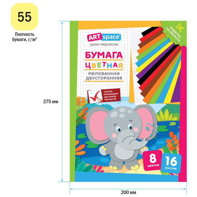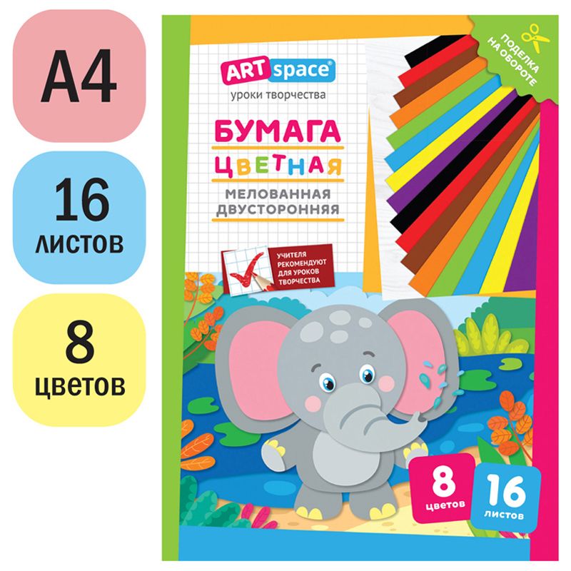 Цветная бумага мелованная А4, ArtSpace, двустор., 16л., 8цв., "Слон"
