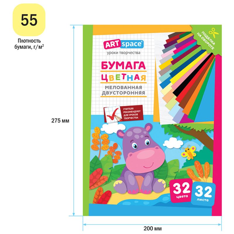 Цветная бумага мелованная А4, ArtSpace, двустор., 32л., 32цв., "Бегемот"