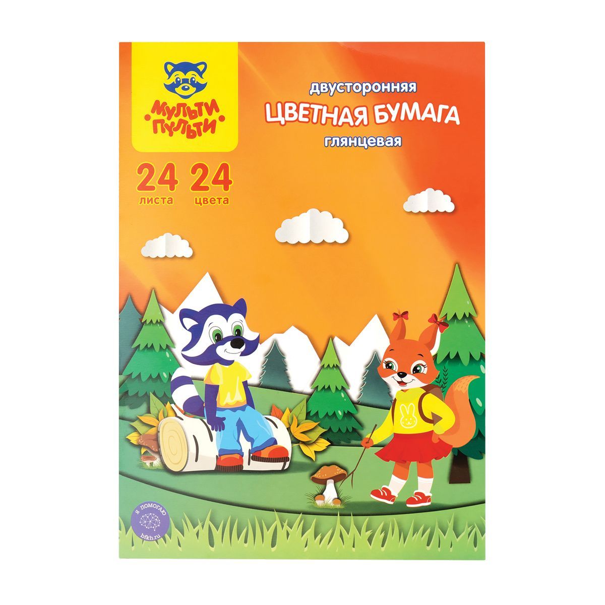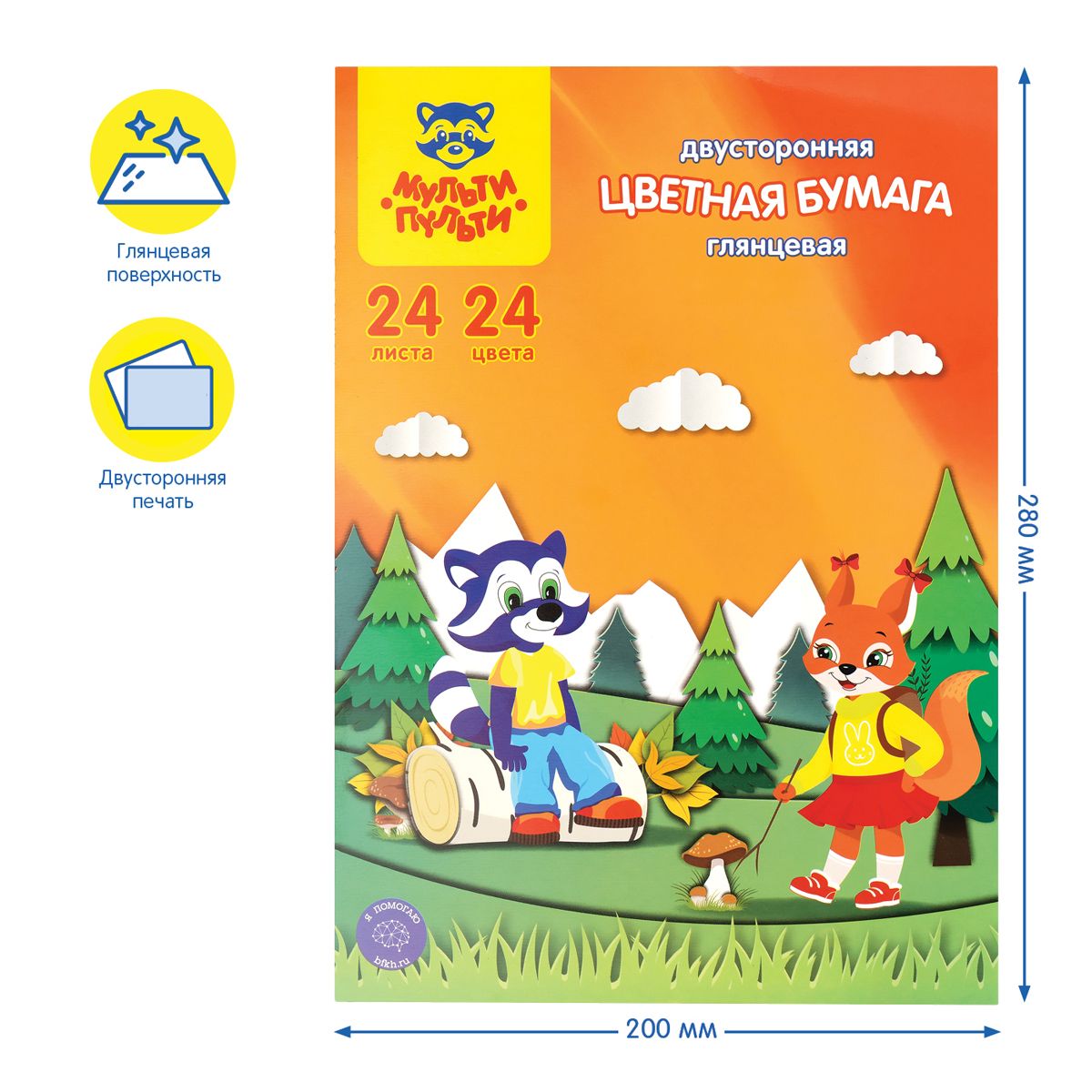 Цветная бумага мелованная А4, Мульти-Пульти, двустор., 24л., 24цв., в папке, "Приключения Енота"