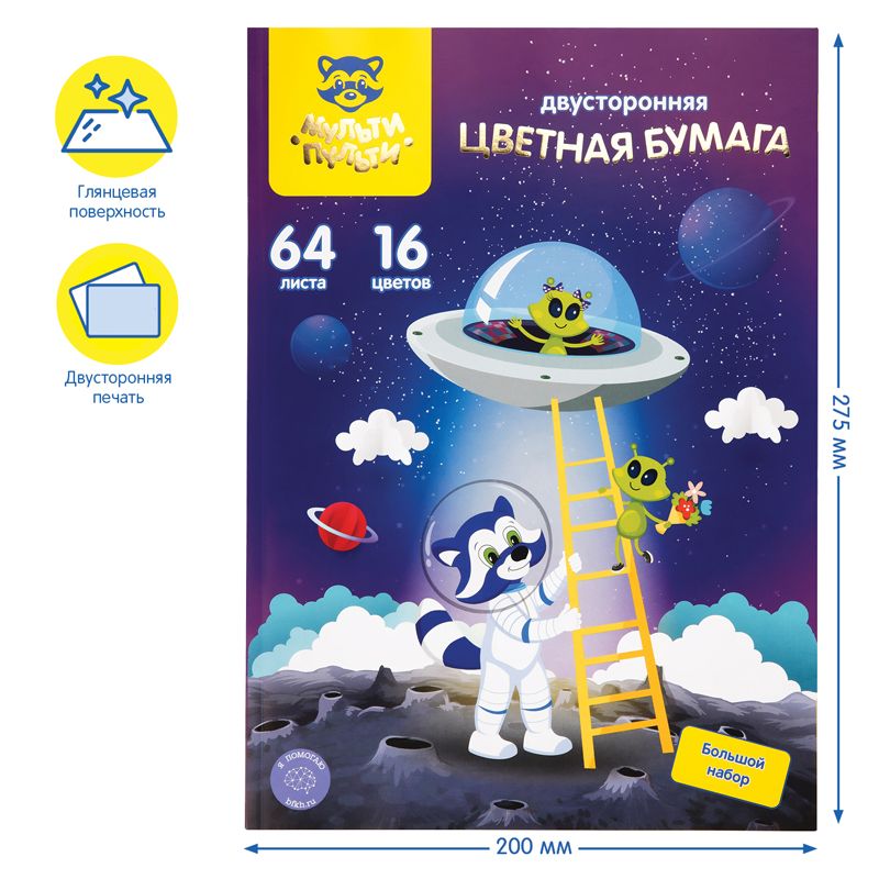 Цветная бумага мелованная А4, Мульти-Пульти, двустор., 64л., 16цв., на склейке, "Енот в космосе"
