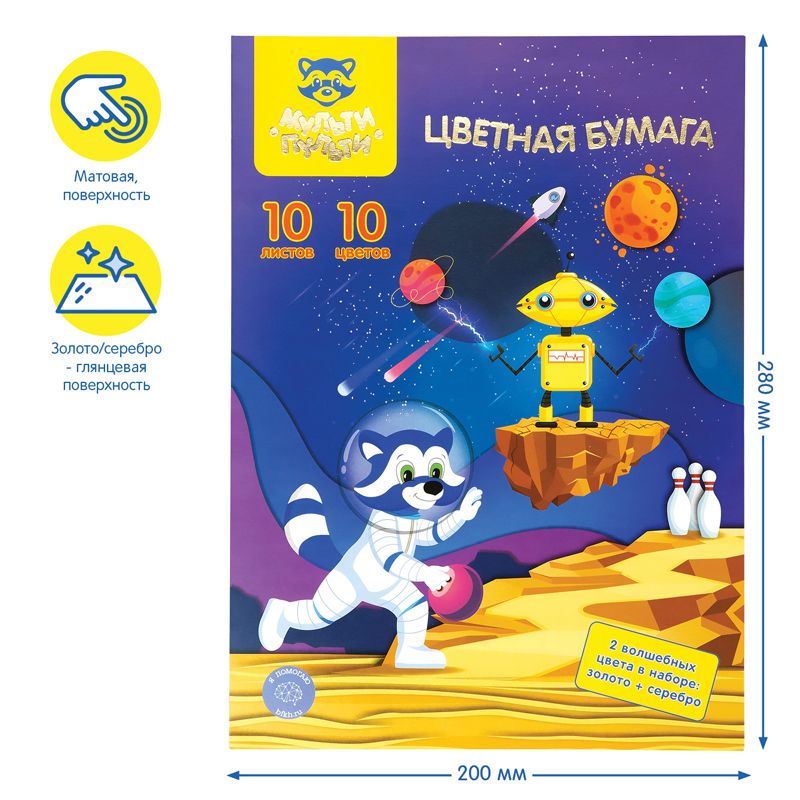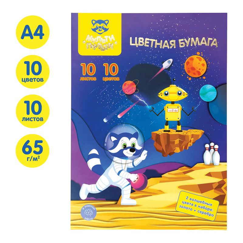 Цветная бумага офсетная А4, Мульти-Пульти, 10л., 10цв., в папке, "Енот в космосе. Волшебная"