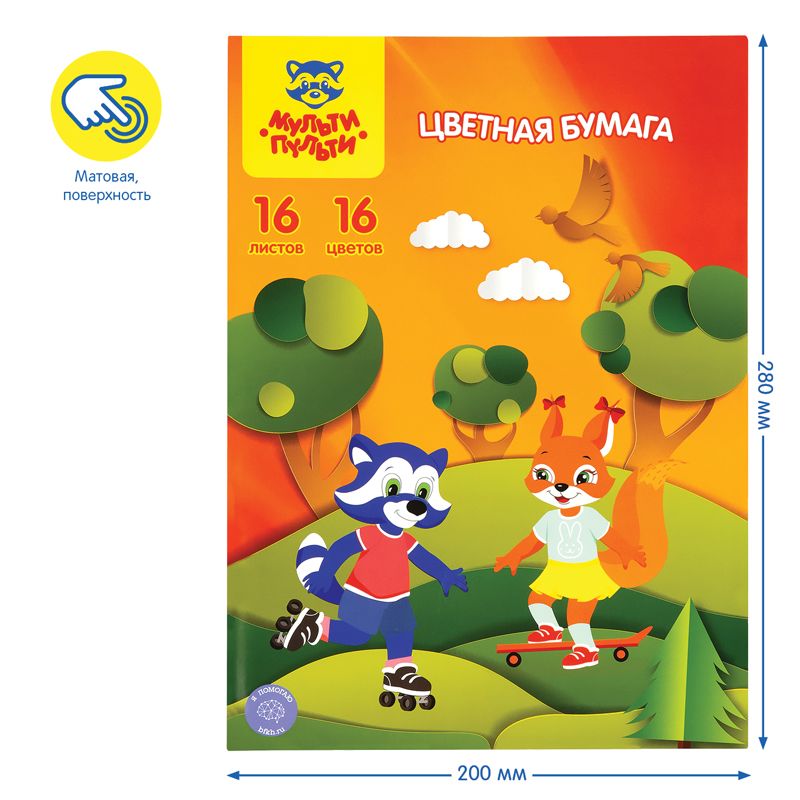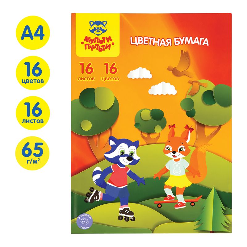 Цветная бумага офсетная А4, Мульти-Пульти, 16л., 16цв., на скобе, "Приключения Енота"