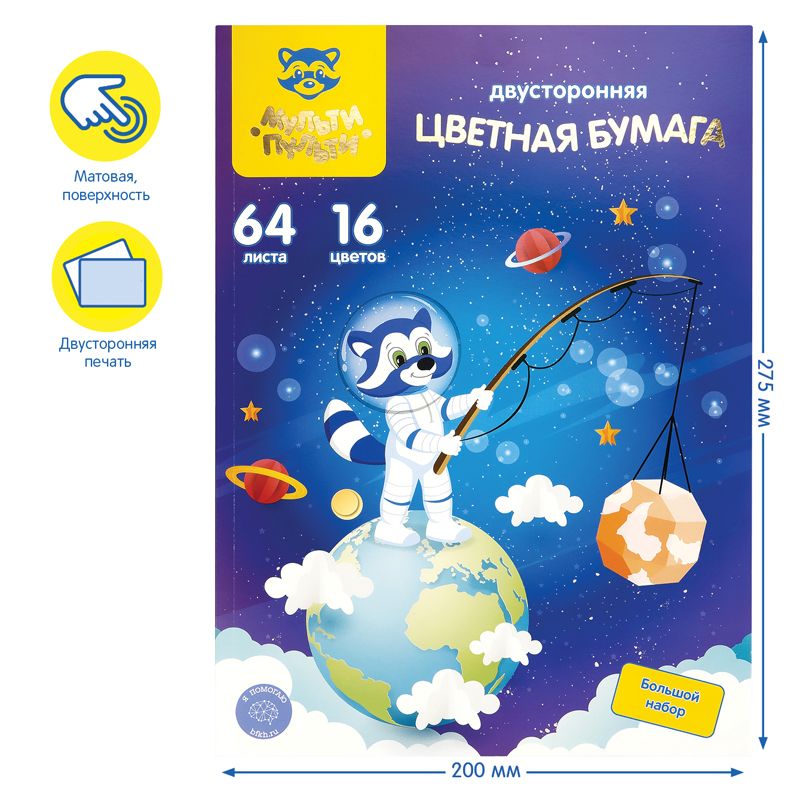 Цветная бумага офсетная А4, Мульти-Пульти, двустор., 64л., 16цв., на склейке, "Енот в космосе"
