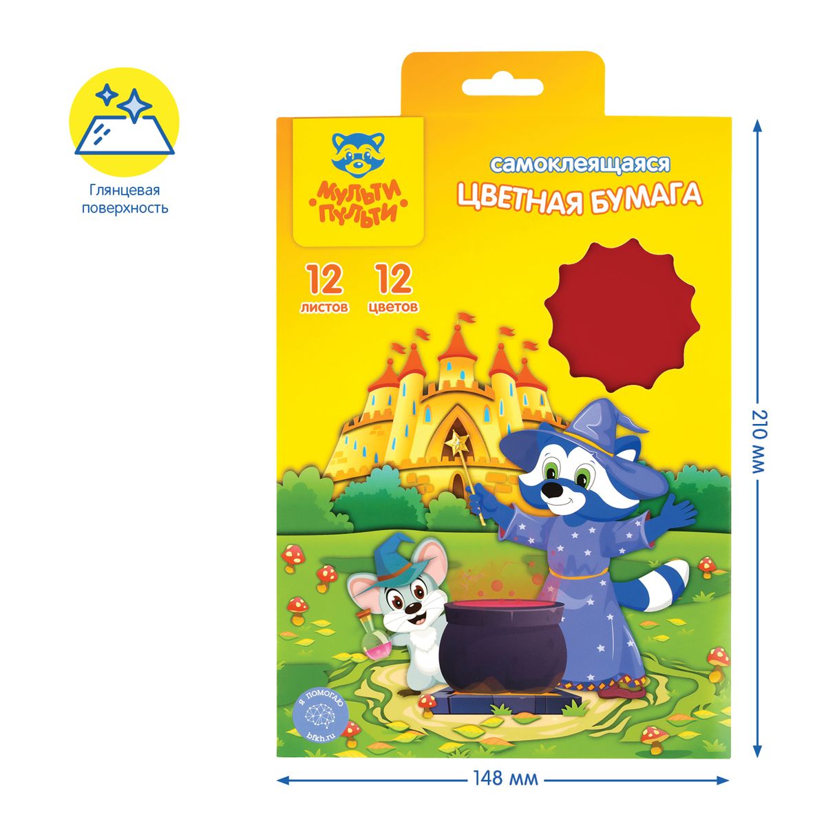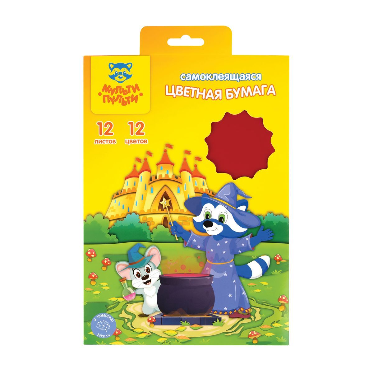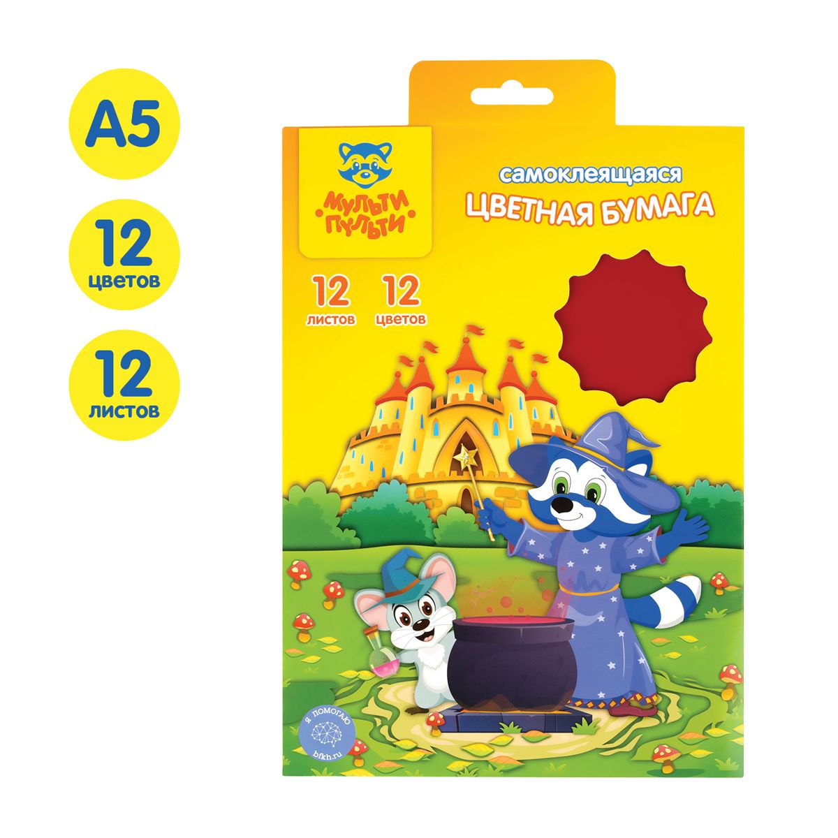 Цветная бумага самоклеящаяся А5, Мульти-Пульти, 12л., 12цв., в папке с европодвесом, "Енот в волшебном мире"