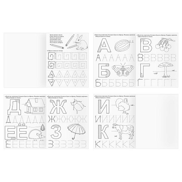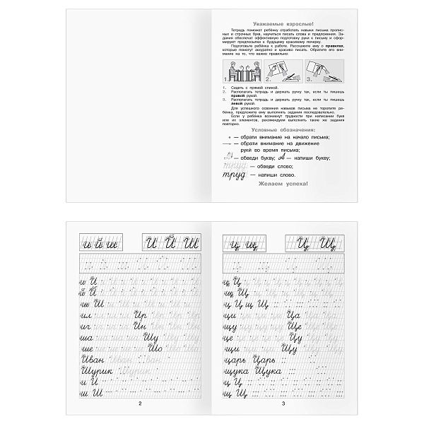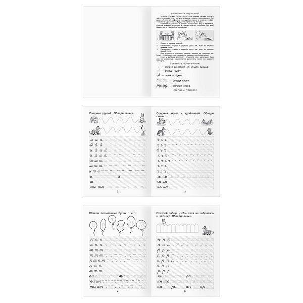 | Росмэн | Прописи буквы | 5–7 | А5, косая линовка | Упражнения на моторику |