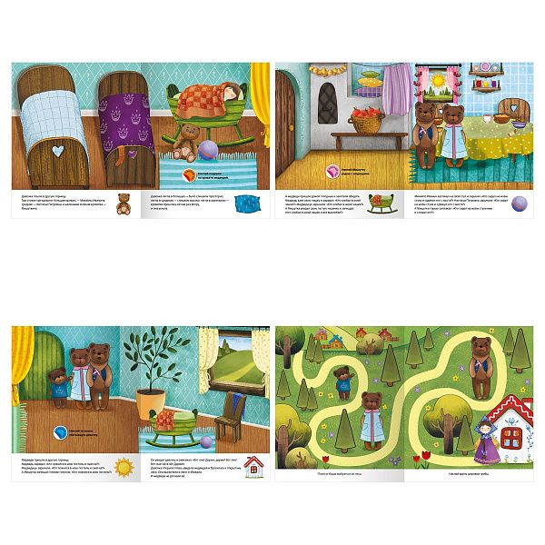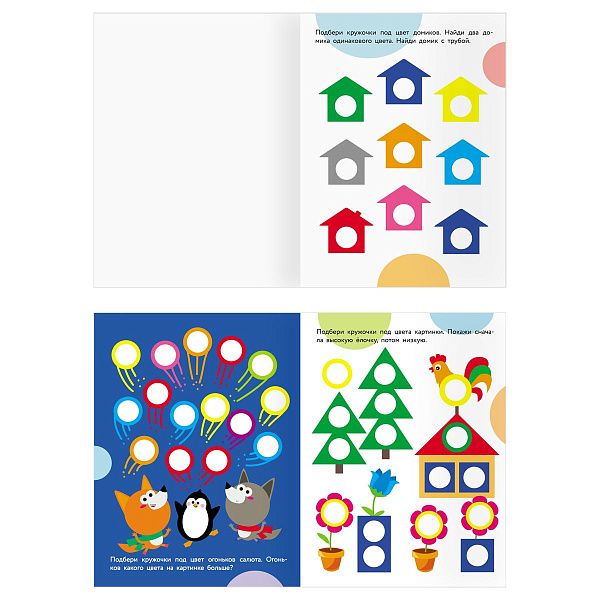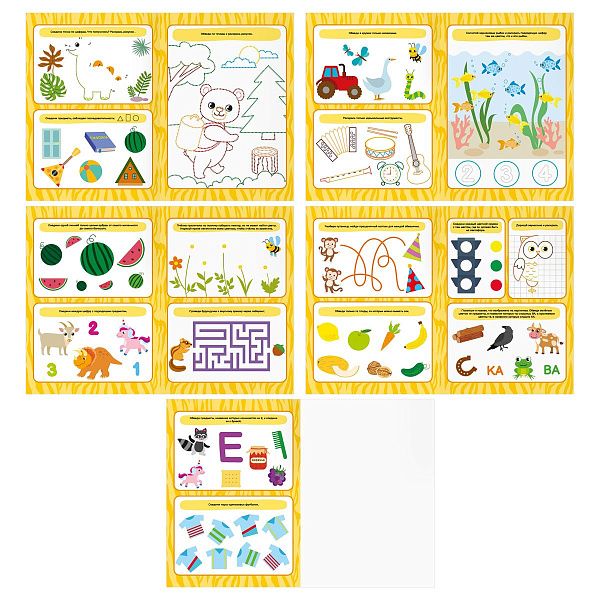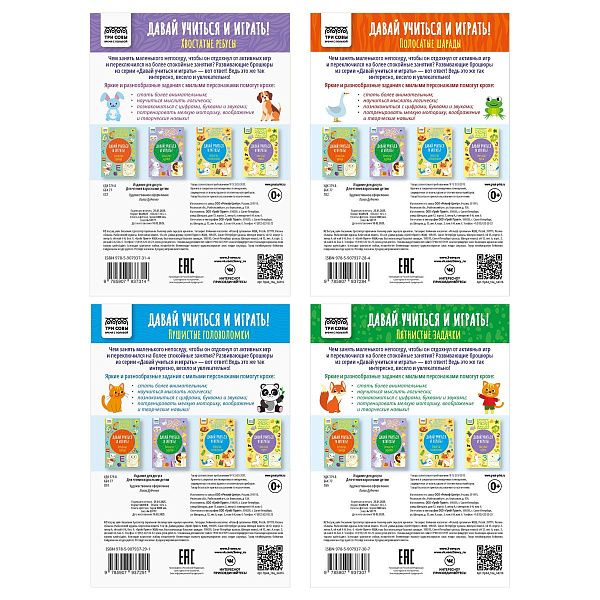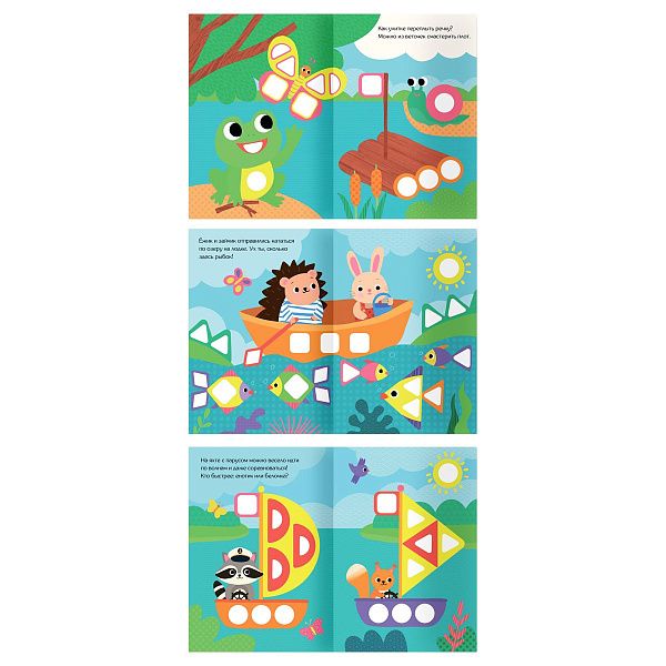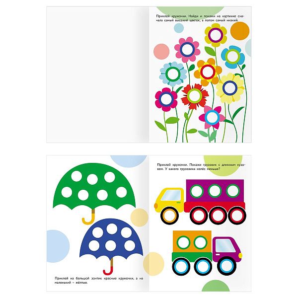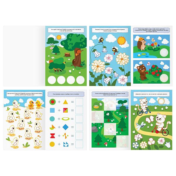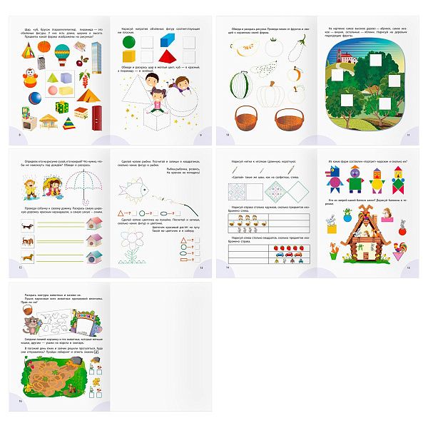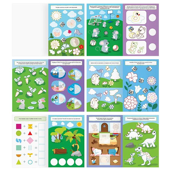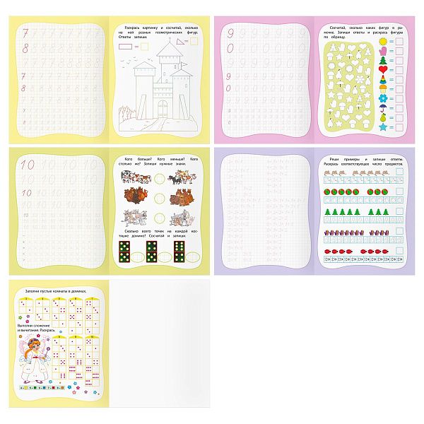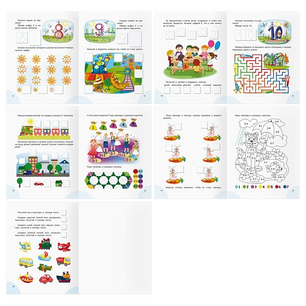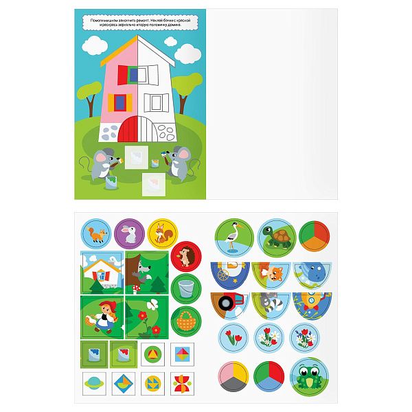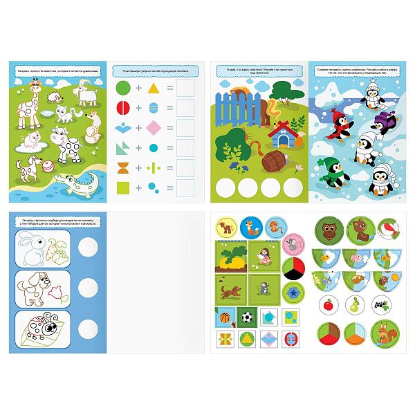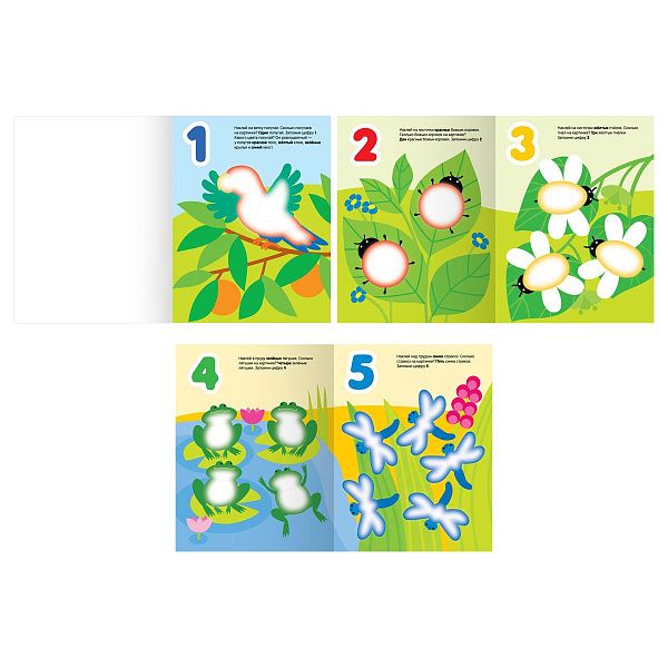 - "Первые шаги в математике" (3–5 лет) помогает освоить счёт с помощью наклеек.