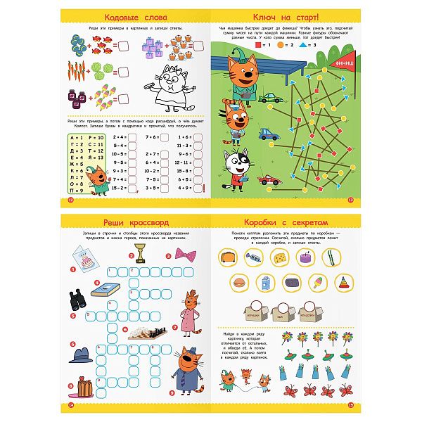 - "Первые шаги в математике" (3–5 лет) помогает освоить счёт с помощью наклеек.