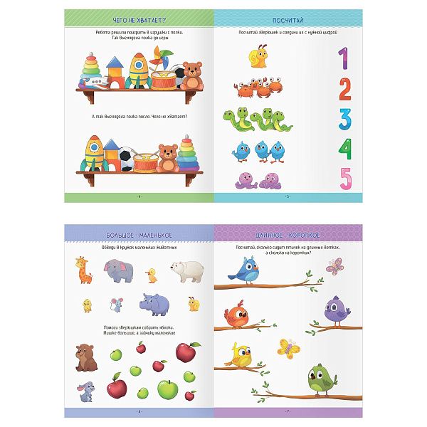 | Умка | Первые шаги в математике | 3–5 | А5, 3–5 лет, наклейки | Задачи с животными |
