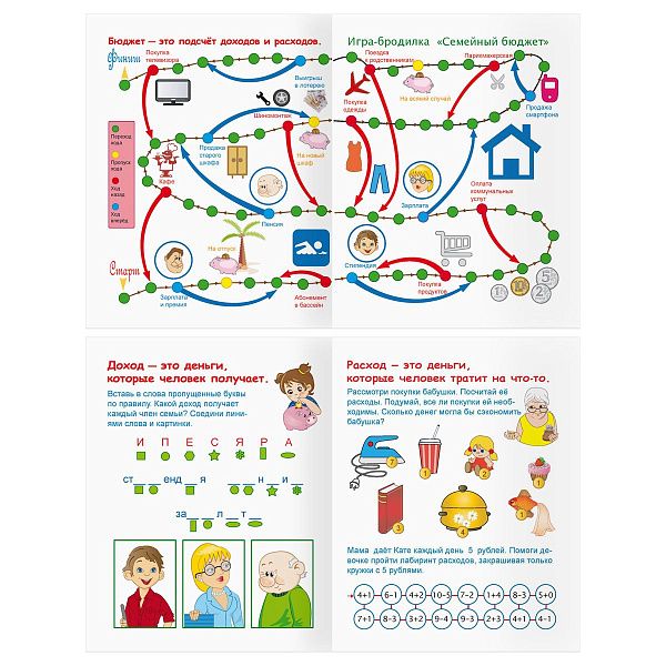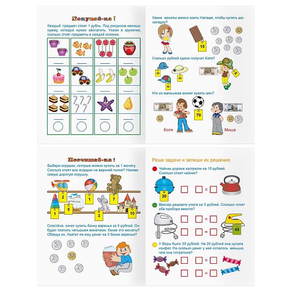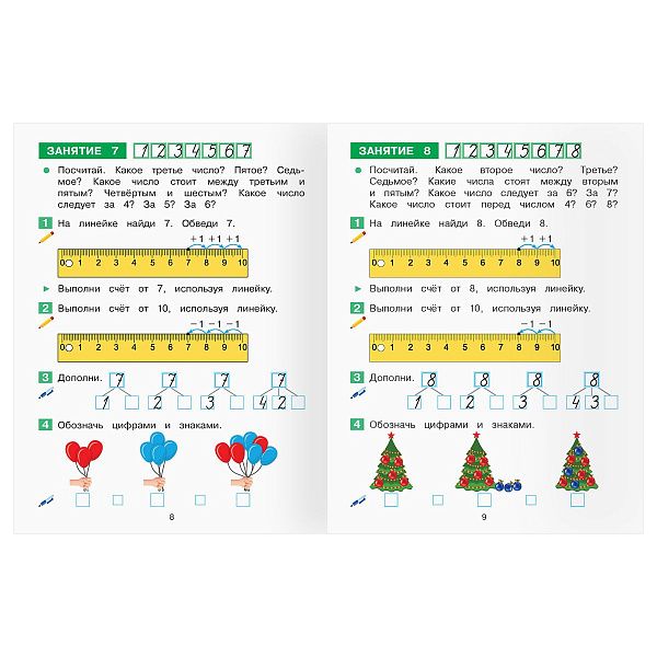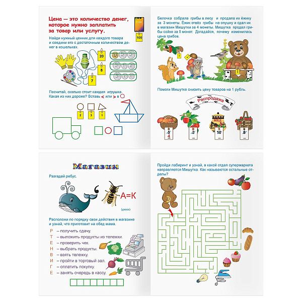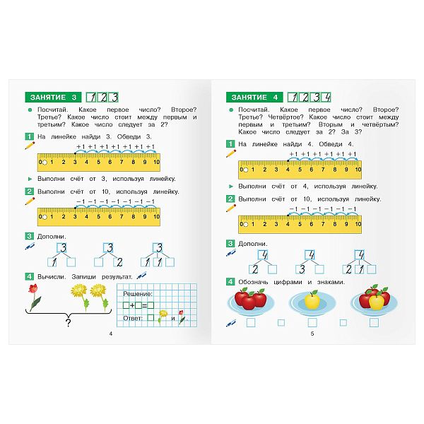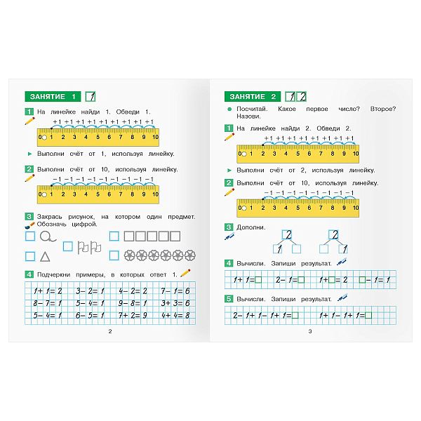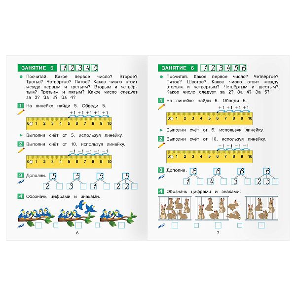 - "Первые шаги в математике" (3–5 лет) помогает освоить счёт с помощью наклеек.