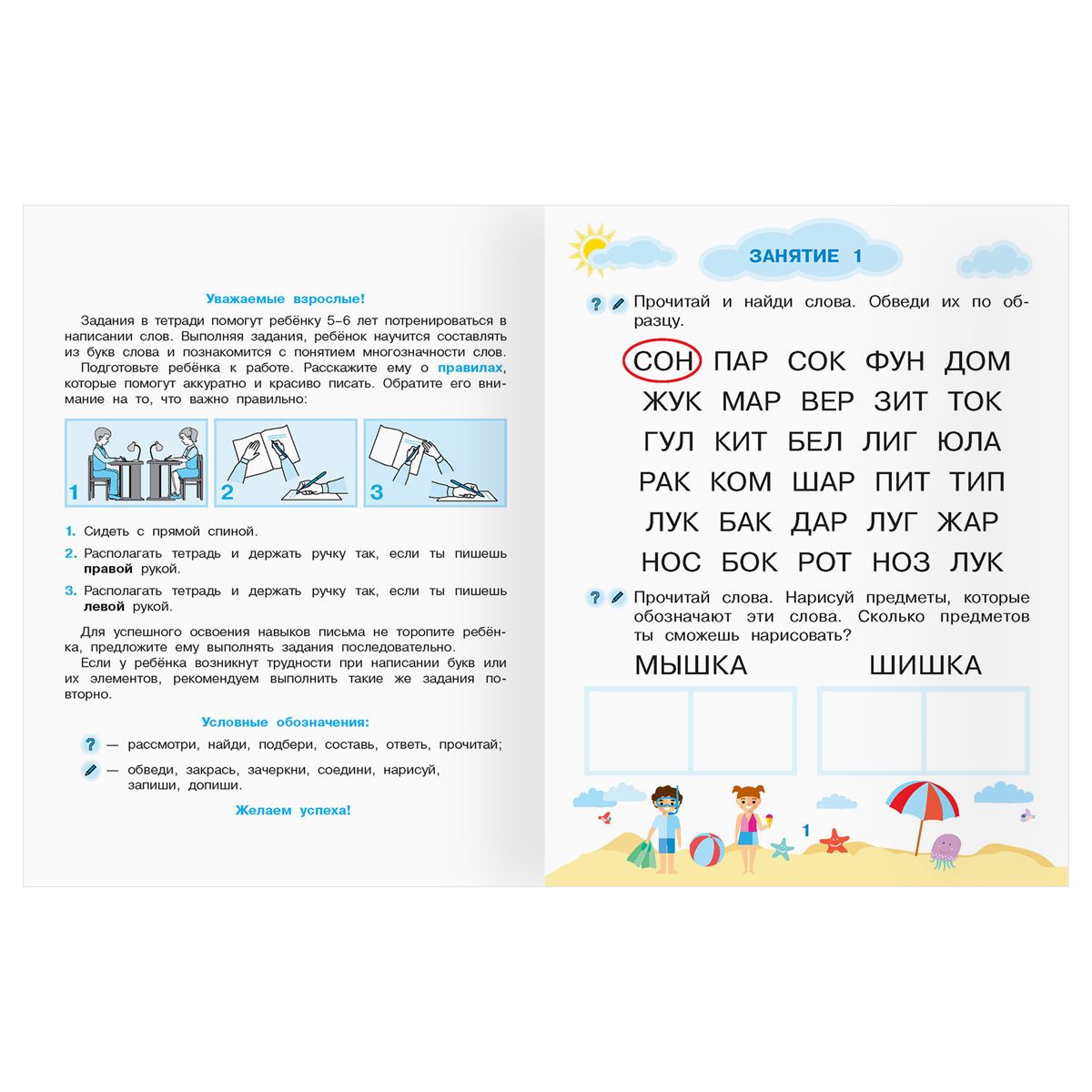 Прописи для дошкольников, А5 ТРИ СОВЫ "5-6 лет. Умные задания. Первые слова", 8стр.