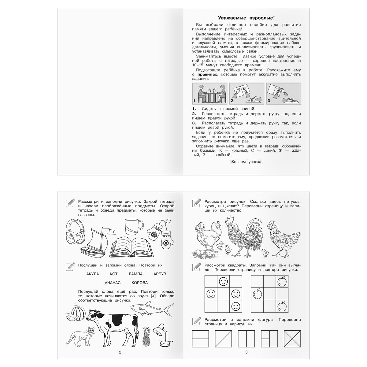 • «Развиваю память» – рабочая тетрадь включает разноплановые задания, направленные на развитие произвольной памяти дошкольников. Их выполнение способствует развитию словесно-логической, зрительной и ассоциативной памяти.