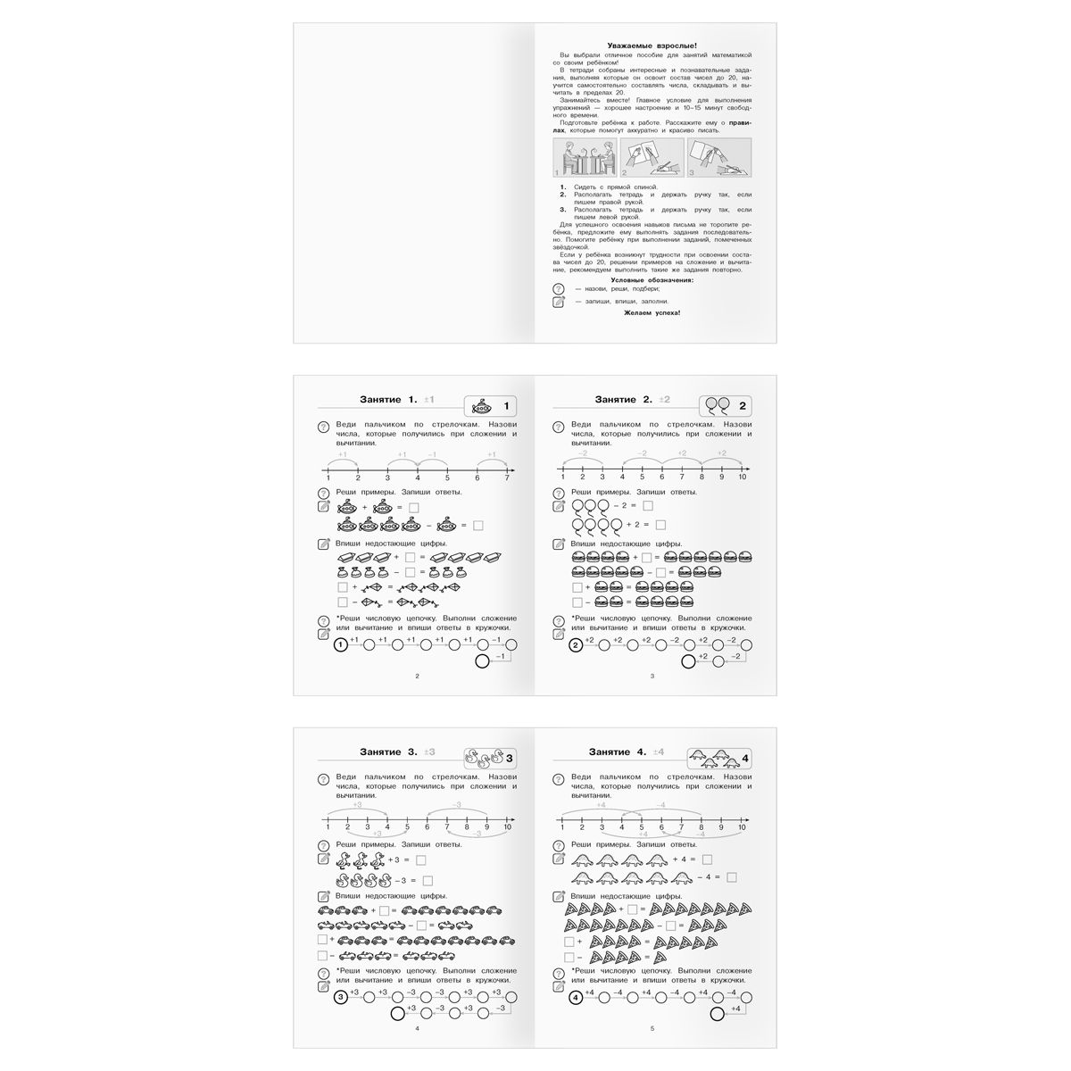 • «Состав чисел до 20» – тетрадь содержит наглядные и доступные примеры, которые помогут ребенку освоить состав чисел до 20, научиться самостоятельно составлять числа, а также складывать и вычитать.