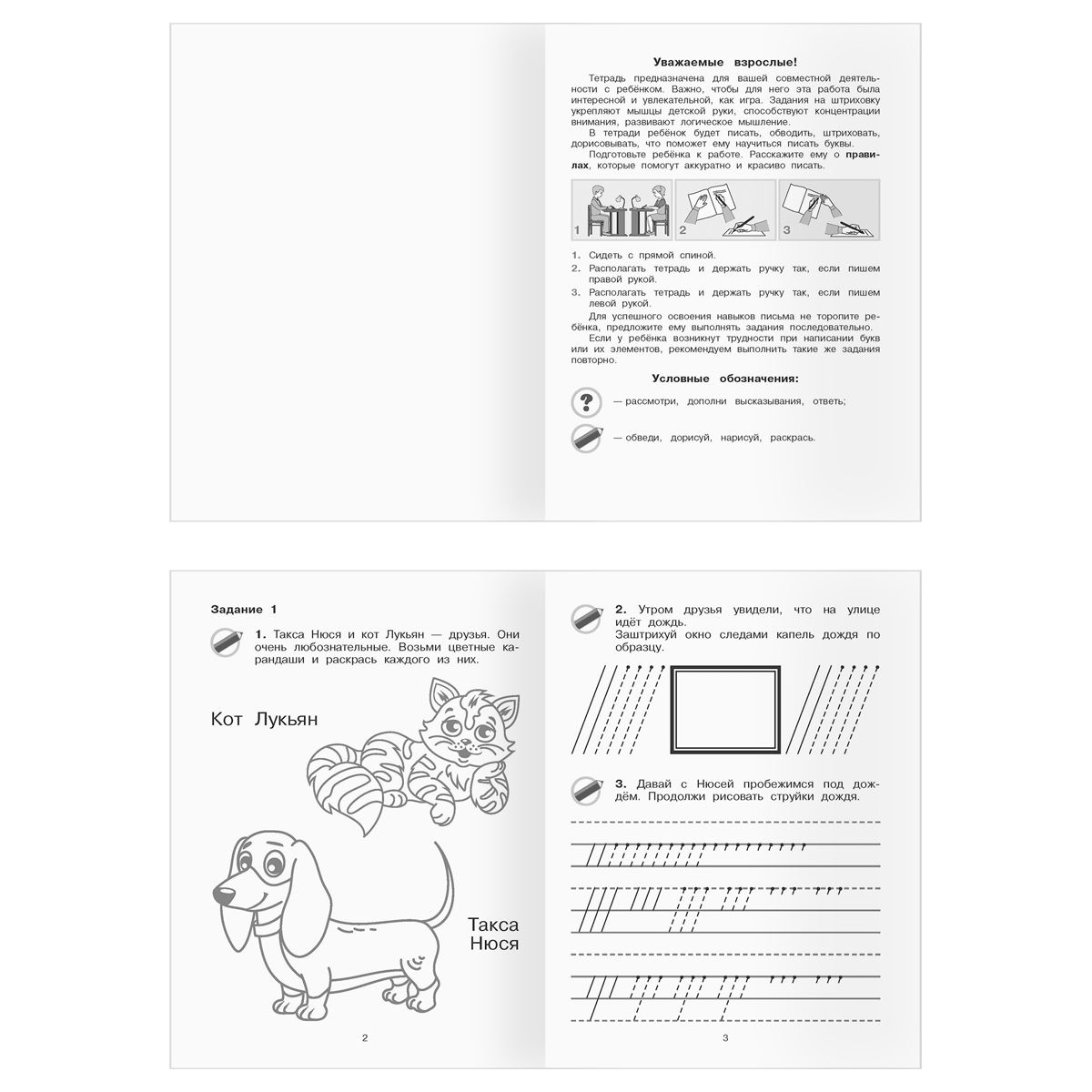 • «Учусь штриховать и дорисовывать» – содержит игровые задания, которые помогут ребенку координировать движение руки, а также тренирует речь, воображение и внимание.