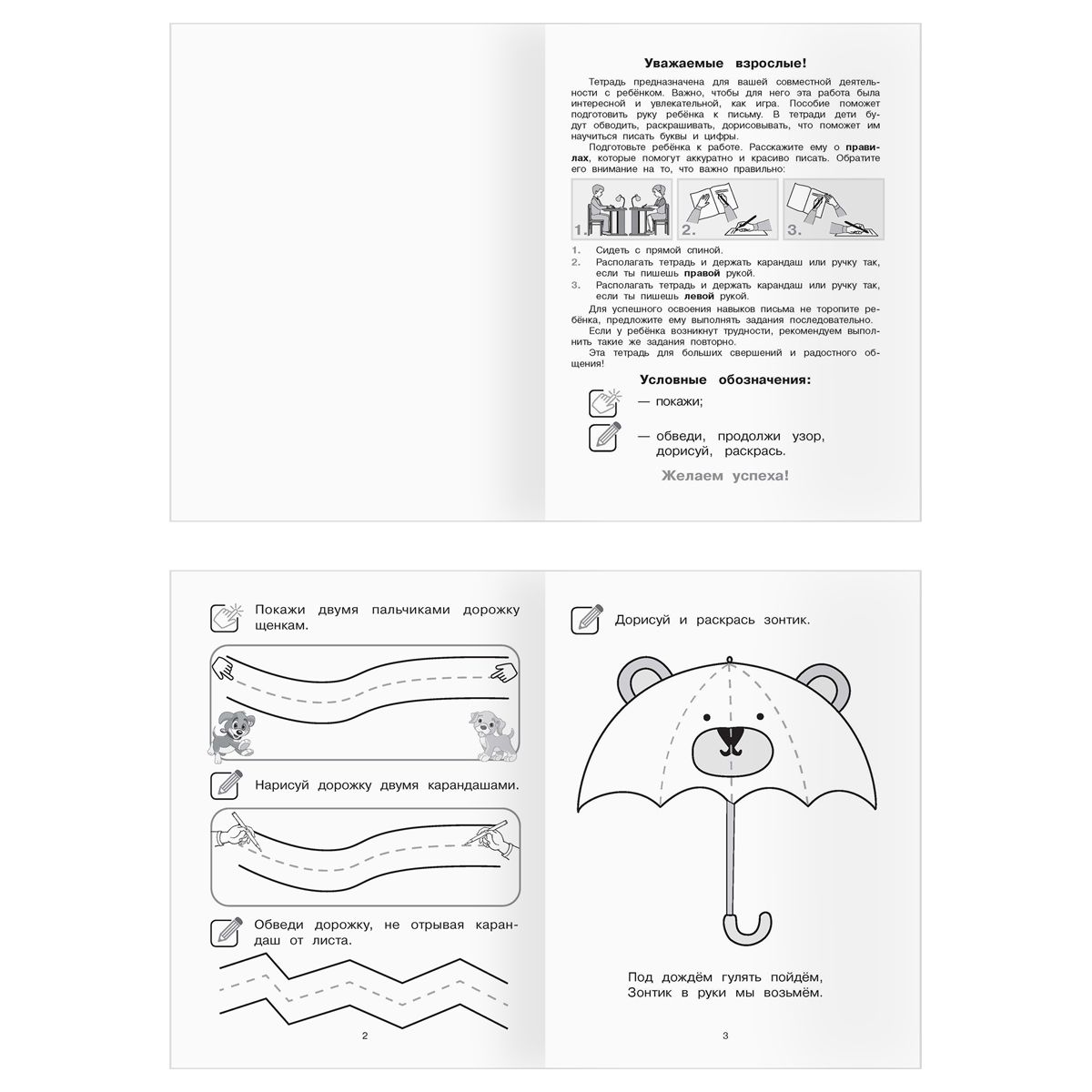 • «Учусь рисовать палочки и крючки» – пособие поможет подготовить руку ребёнка к письму. В тетради дети будут обводить, раскрашивать и дорисовывать буквы и цифры. Предложенные задания направлены на развитие мелкой моторики, улучшение координации и овладение графическими навыками.