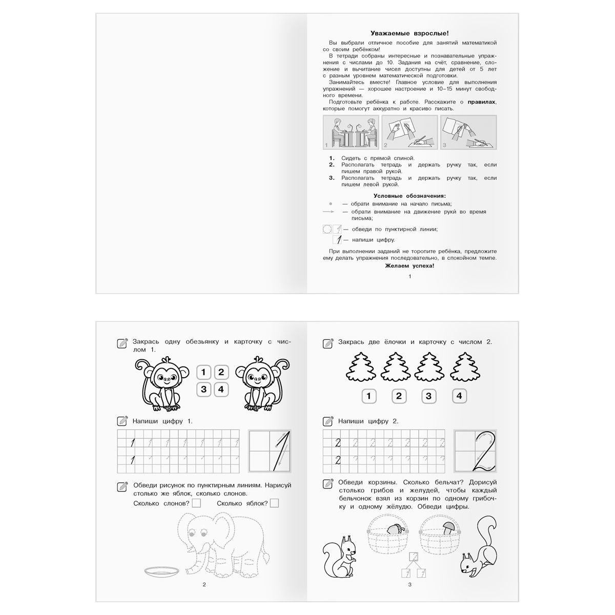 • «Цифры и числа до 10» – пособие направлено на знакомство дошкольников с письмом цифр и числами от 1 до 10. С его помощью формируется умение ориентироваться в тетради с разлиновкой в клетку.