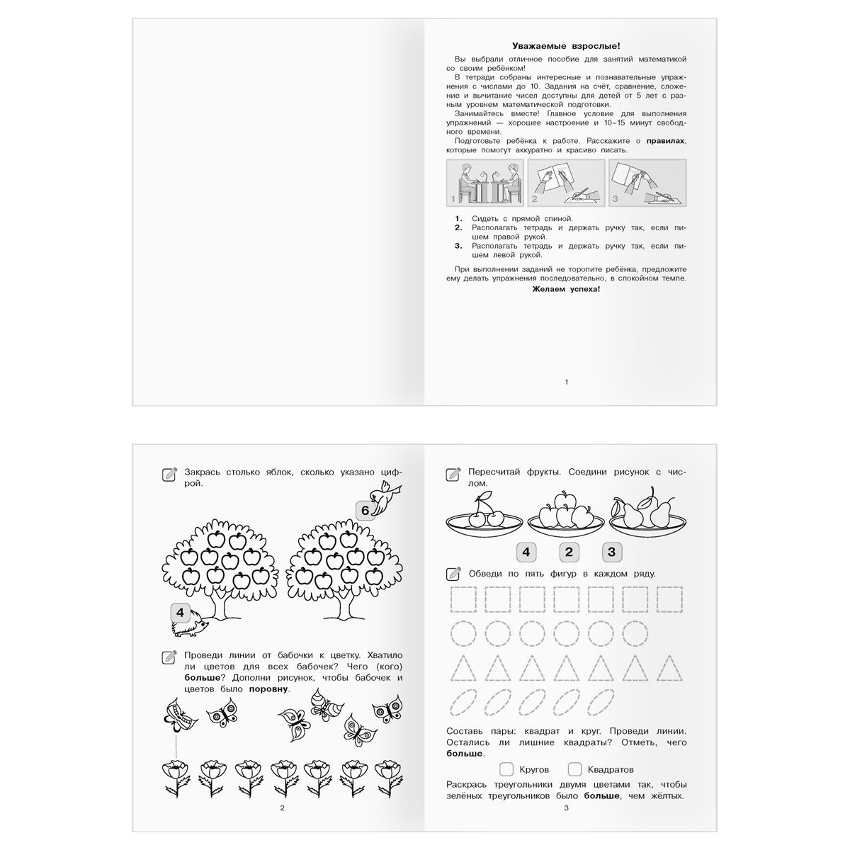 • «Счёт, сравнение, решение задач» – рабочая тетрадь включает разноплановый материал, направленный на формирование у дошкольников умения вести счёт в пределах 10, а также сравнивать однозначные числа. Пособие подготовит детей к решению задач в одно действие (на сложение или вычитание).
