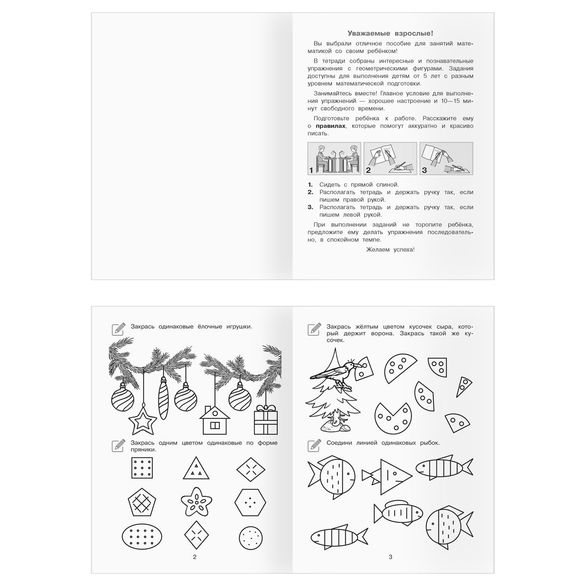 • «Геометрические фигуры» – рабочая тетрадь поможет расширить знания о форме, признаках и особенностях геометрических фигур. Дети научатся находить отличия и сходства между фигурами, а также определять их признаки.