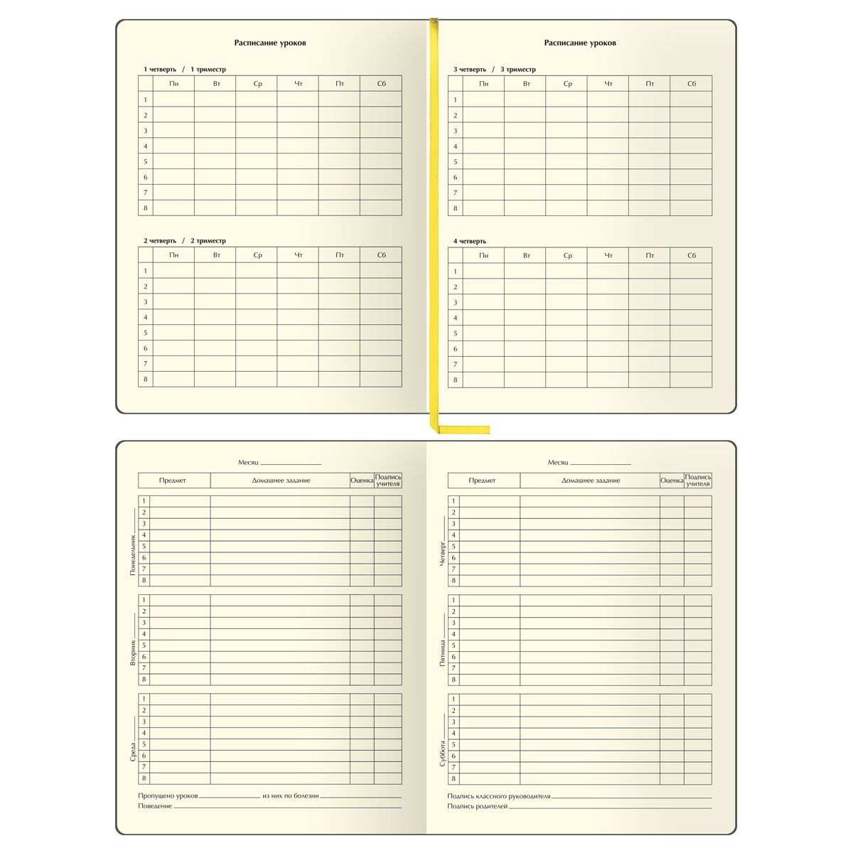 Внутренний блок состоит из 48 листов тонированной офсетной бумаги плотностью 70 г/м2. Печать блока в 1 краску. Учебный день рассчитан на 8 уроков. Дневник содержит 14 страниц для личных данных.