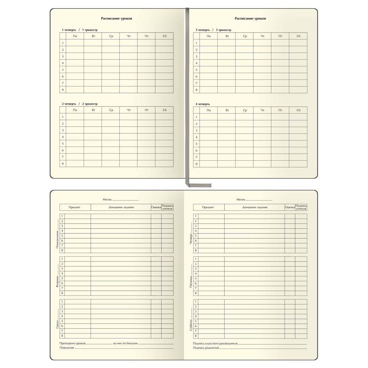 Внутренний блок состоит из 48 листов тонированной офсетной бумаги плотностью 70 г/м2. Блок напечатан с использованием 1 краски. Учебный день рассчитан на восемь уроков. Дневник содержит 14 страниц для личных данных.