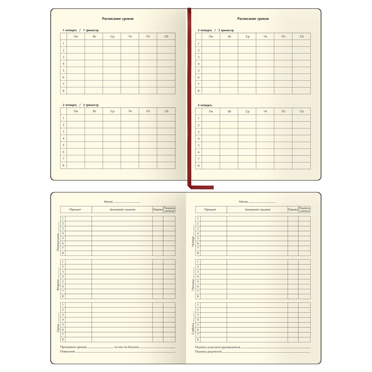 Внутренний блок состоит из 48 листов тонированной офсетной бумаги плотностью 70 г/м2. Блок напечатан с использованием 1 краски. Учебный день рассчитан на восемь уроков. Дневник содержит 14 страниц для личных данных.