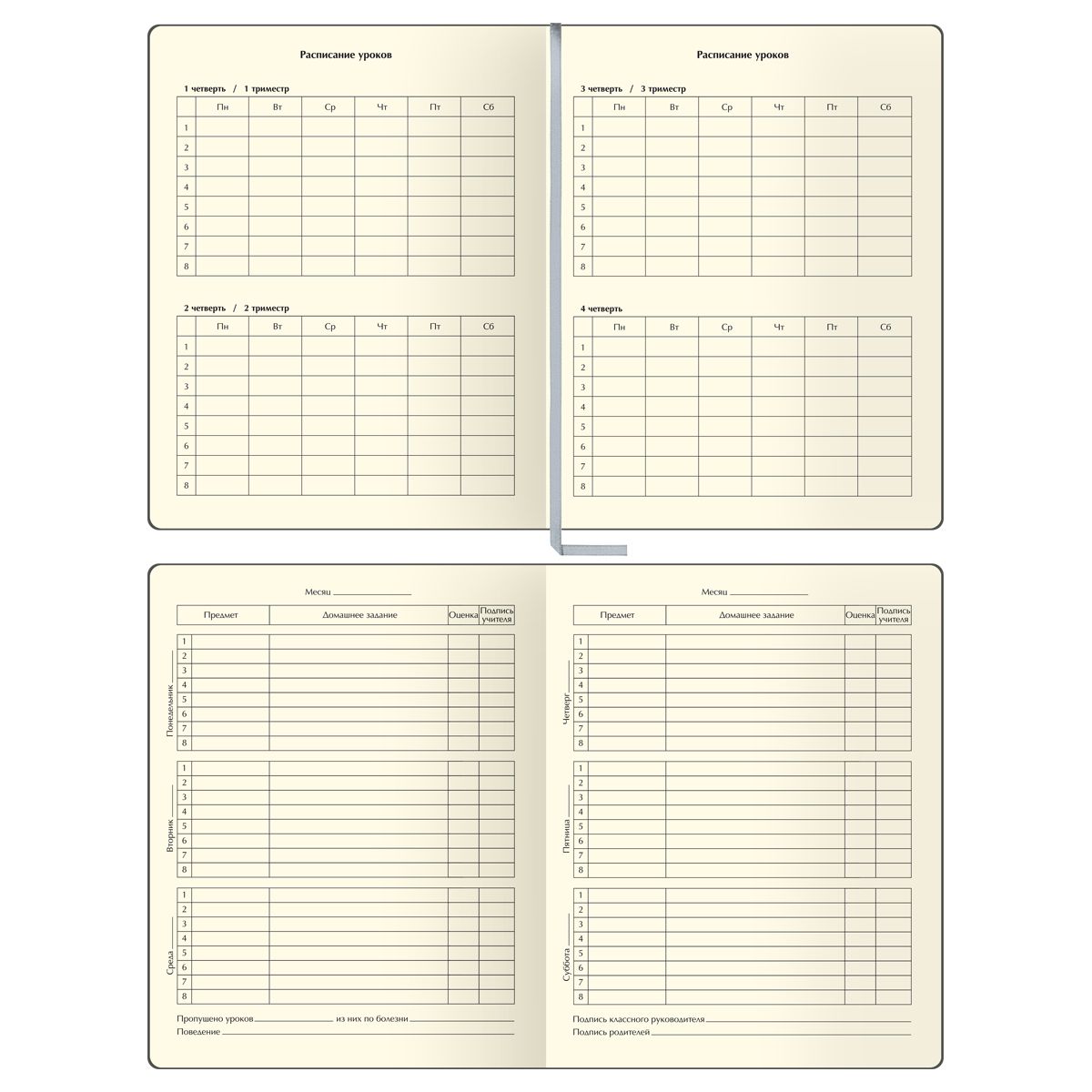 Внутренний блок состоит из 48 листов тонированной офсетной бумаги плотностью 70 г/м2. Печать блока в 1 краску. Учебный день рассчитан на 8 уроков. Дневник содержит 14 страниц для личных данных.