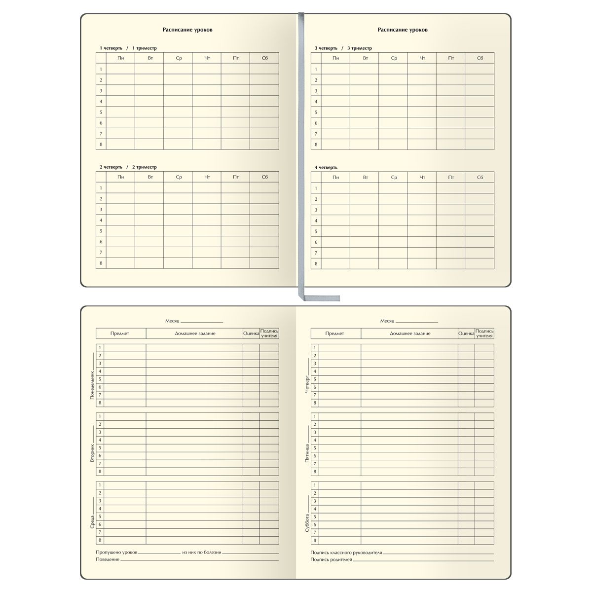 Внутренний блок состоит из 48 листов тонированной офсетной бумаги плотностью 70 г/м2. Печать блока в 1 краску. Учебный день рассчитан на 8 уроков. Дневник содержит 14 страниц для личных данных.