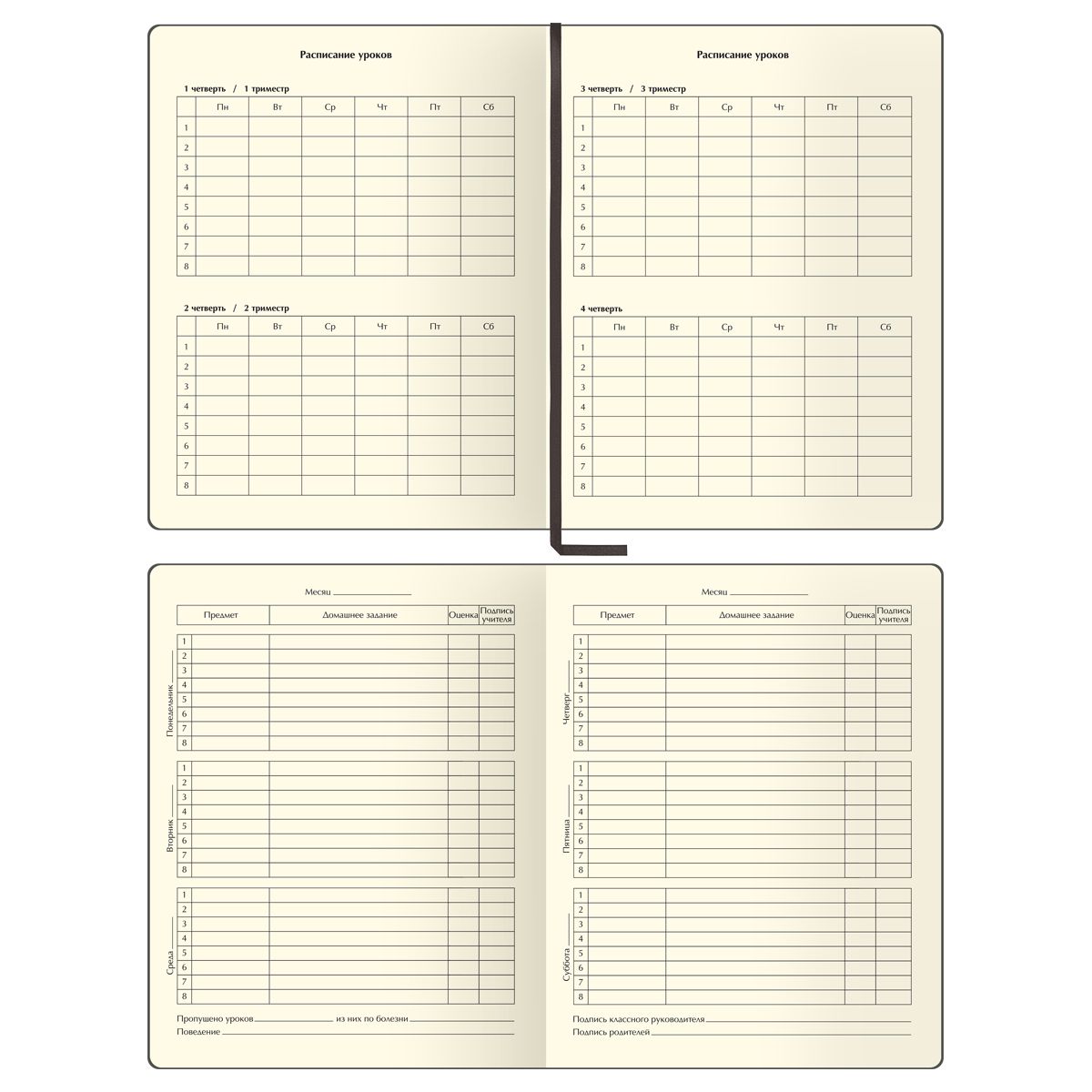Твёрдая обложка выполнена из экокожи. Скругленные уголки обеспечивают безопасность во время использования, а также предотвращают быстрое изнашивание обложки. Закладка-ляссе помогает сразу открыть нужную страницу. Дневник упакован в индивидуальный пакет с этикеткой.