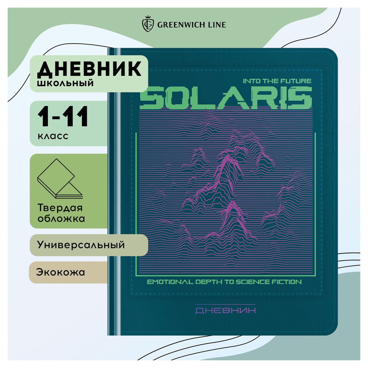 УЦЕНКА - Дневник 1-11 кл. 48л. (твердый) Greenwich Line "Solaris", иск. кожа, аппликация с УФ-печатью, тисн. фольгой, , тон. блок, ляссе (осн 348103)