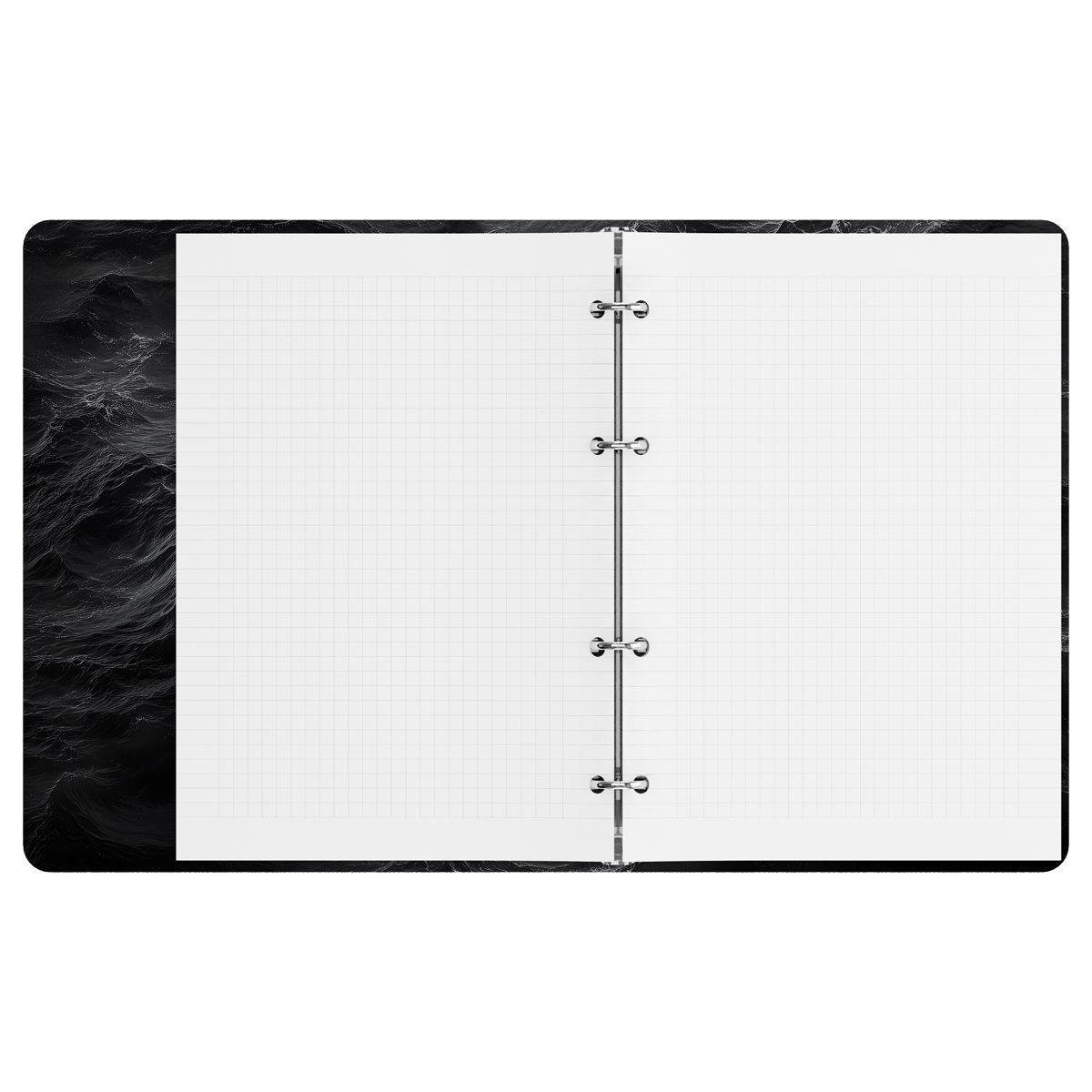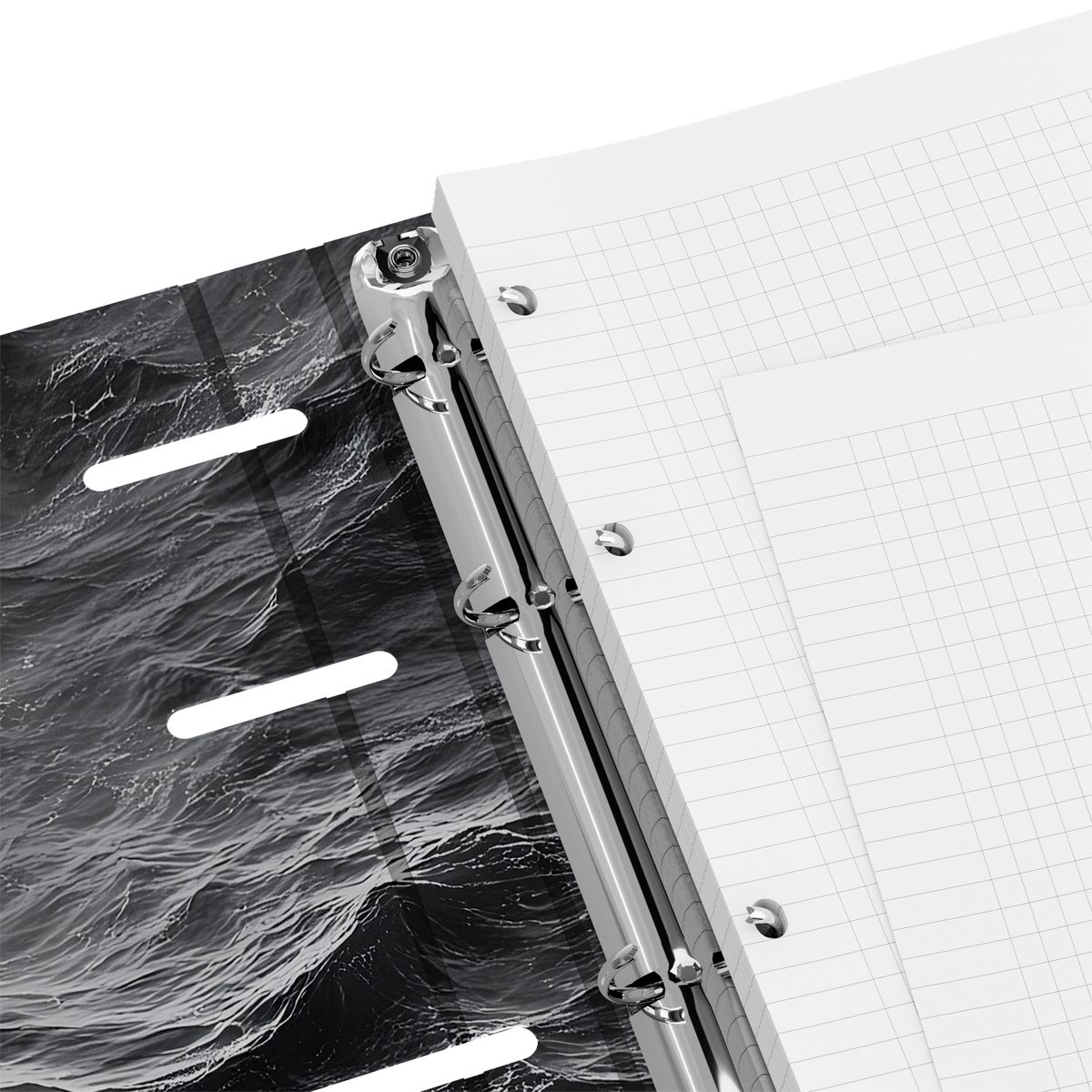 Механизм из 4 колец обеспечивает быструю смену или добавление листов при необходимости. Обложка сделана из плотного картона, который надёжно защищает внутренний блок. Отделка обложки — матовая ламинация. Тетрадь упакована в картон и индивидуальный пакет.