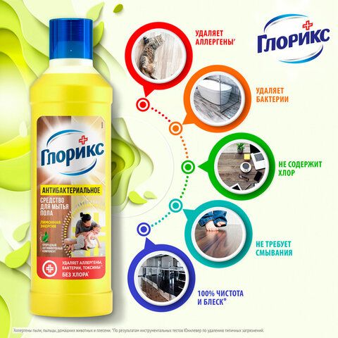 Средство для мытья пола дезинфицирующее 1 л GLORIX (Глорикс) "Лимонная Энергия", без хлора, 8677296