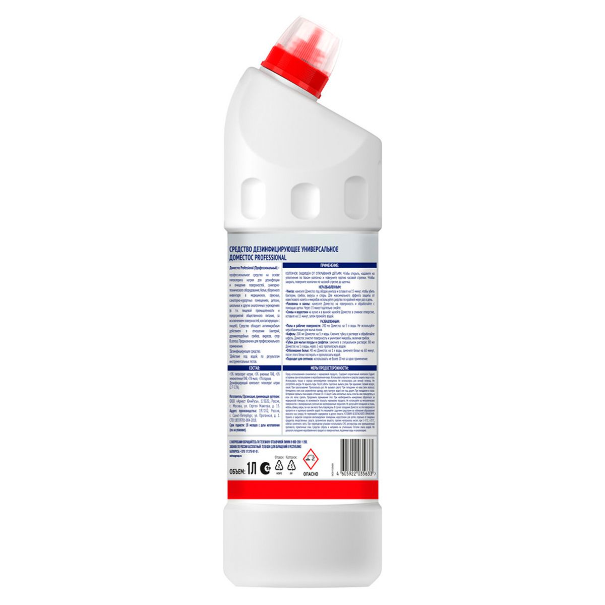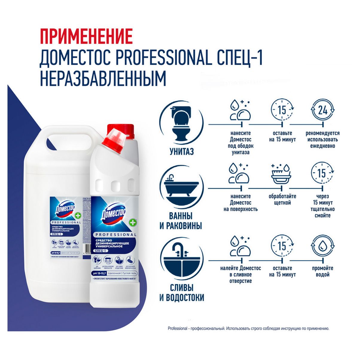 Чистящее средство для клининга Доместос Professional эффективно для чистоты и гигиены полов и рабочих поверхностей, унитазов, кафеля, раковин и ванн, устранения неприятных запахов. С его помощью легко провести антимикробную, антибактериальную, противовирусную и противогрибковую обработку поверхностей. Гель Доместос не только уничтожает до 100% микробов, но и препятствует образованию известкового налета на поверхности сантехники. Доместос Professional рекомендован для очищения и дезинфекции тряпок, ветоши и губок для посуды, отбеливания белья.