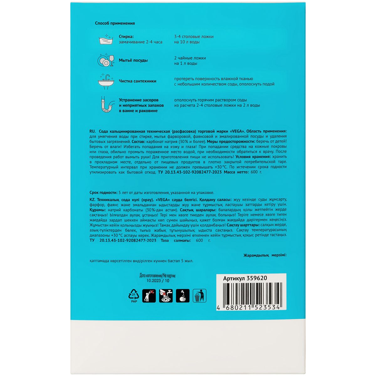 Сода кальцинированная, Vega, 600г, картонная коробка