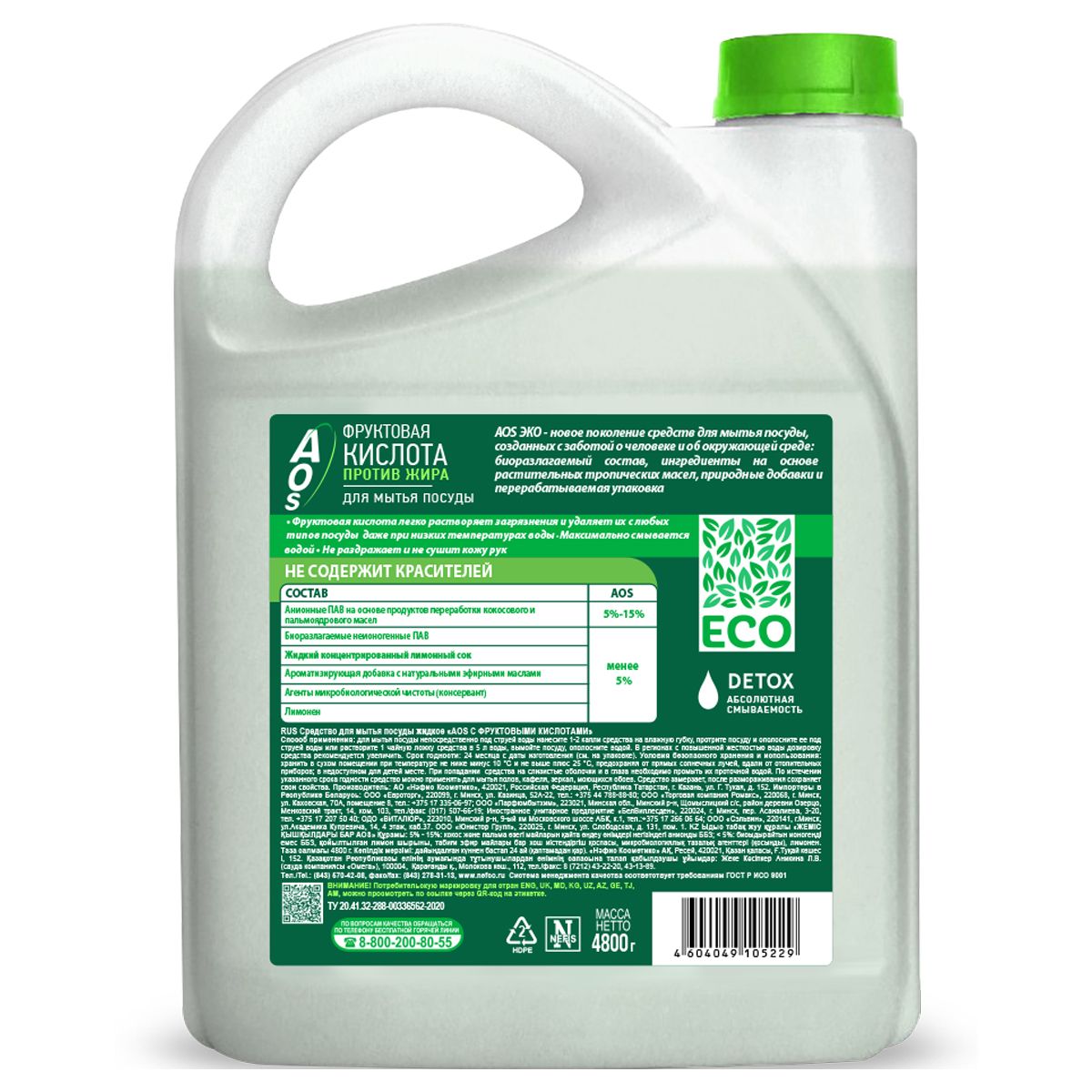 Средство для мытья посуды AOS ЭКО "С Фруктовыми кислотами", 4,8л, канистра