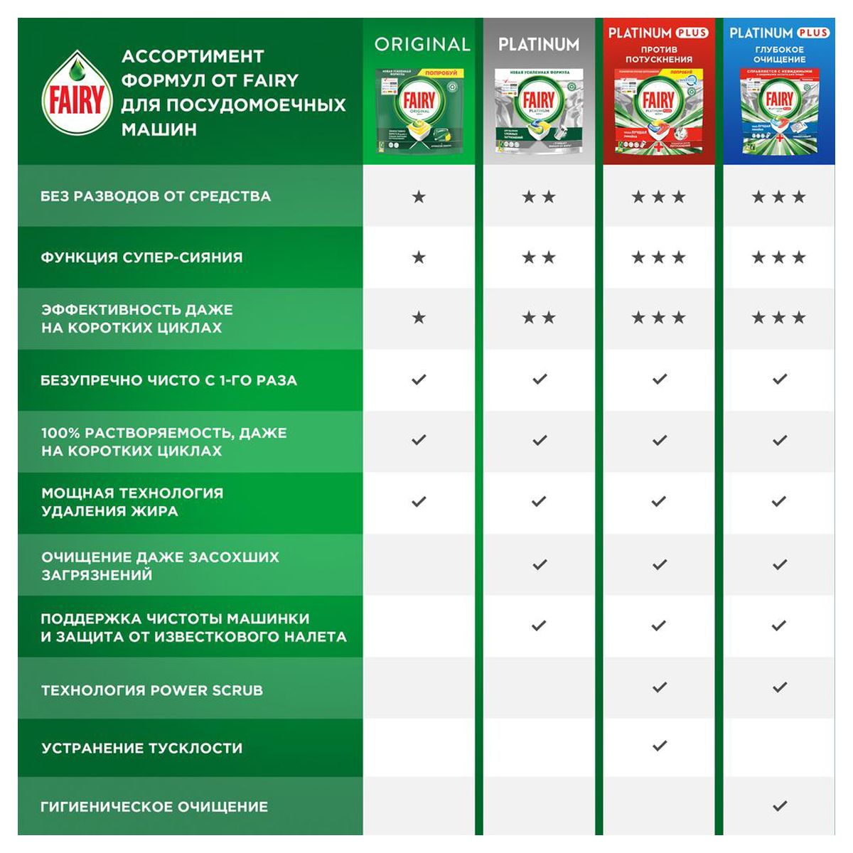 Все капсулы линейки Fairy для посудомоечных машин содержат в себе моющее средствор (гель и порошок), а также соль и ополаскиватель. Таблетки не содержат фосфатов.
