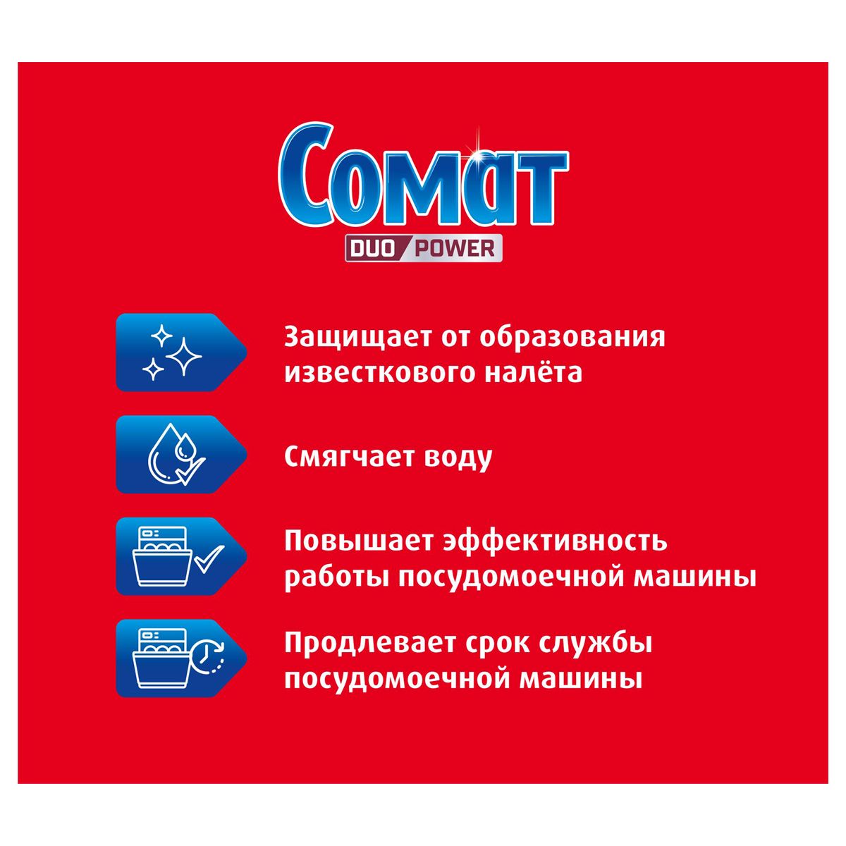 - Сомат смягчает воду, тем самым обеспечивает лучшее качество мытья посуды.
