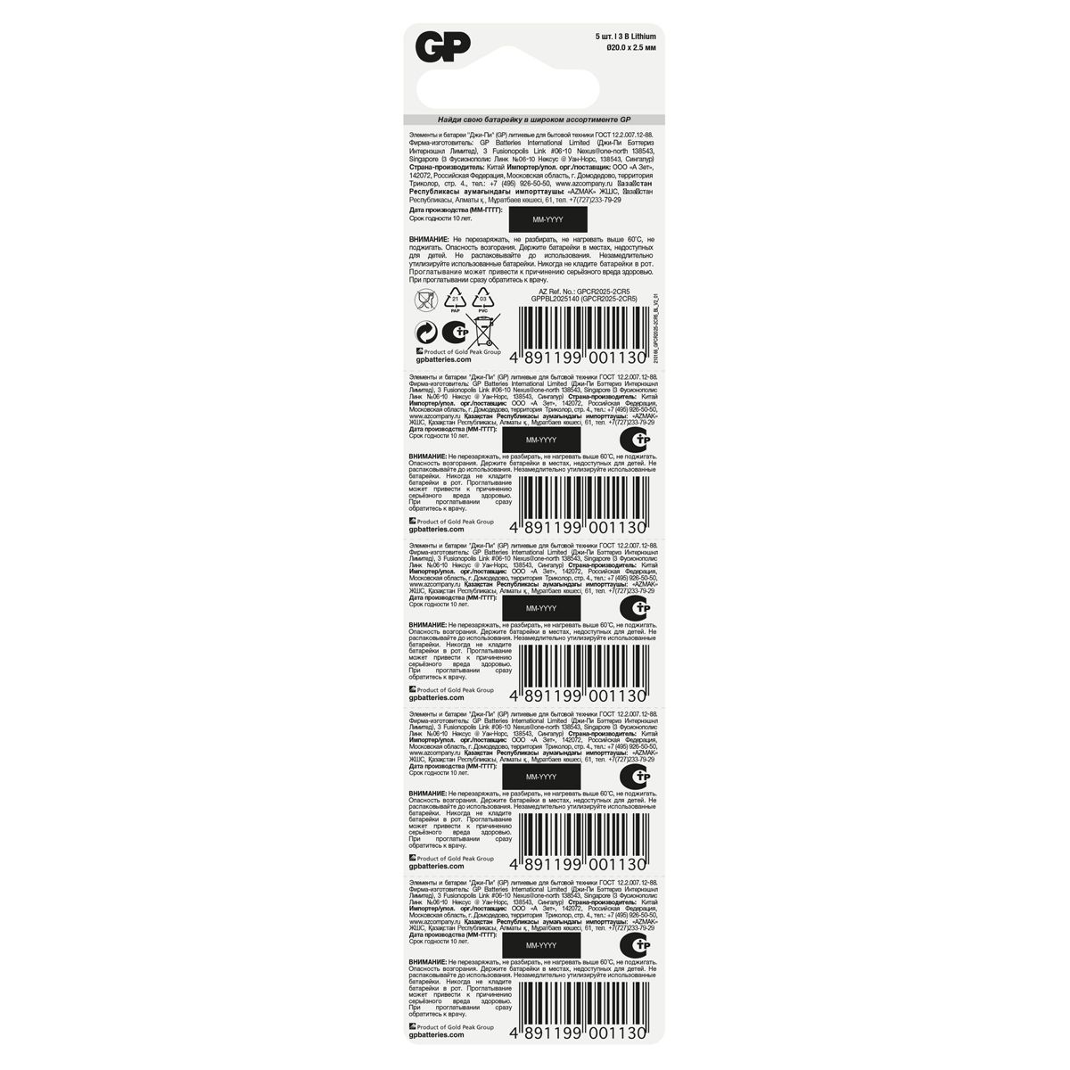 Батарейка GP CR2025 (DL2025) литиевая, BC5