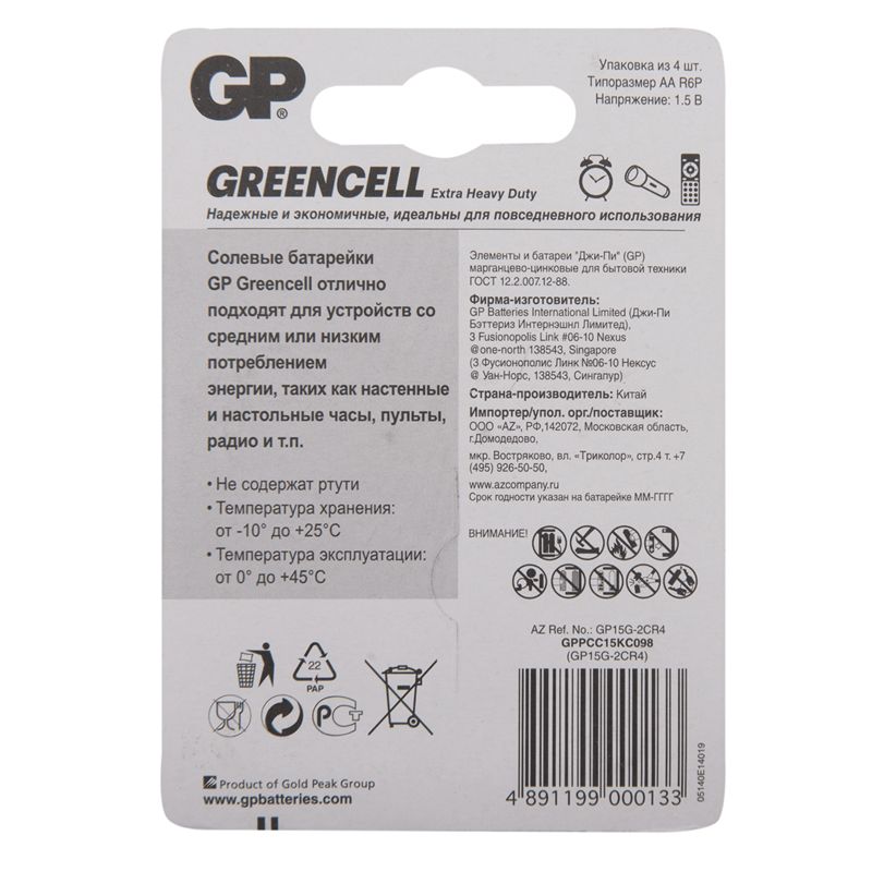 Батарейка GP Greencell AA (R6) 15S солевая, BL4