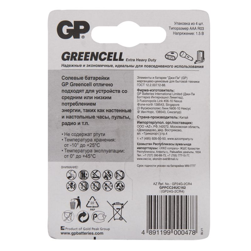 Батарейка GP Greencell AAA (R03) 24S солевая, BL4