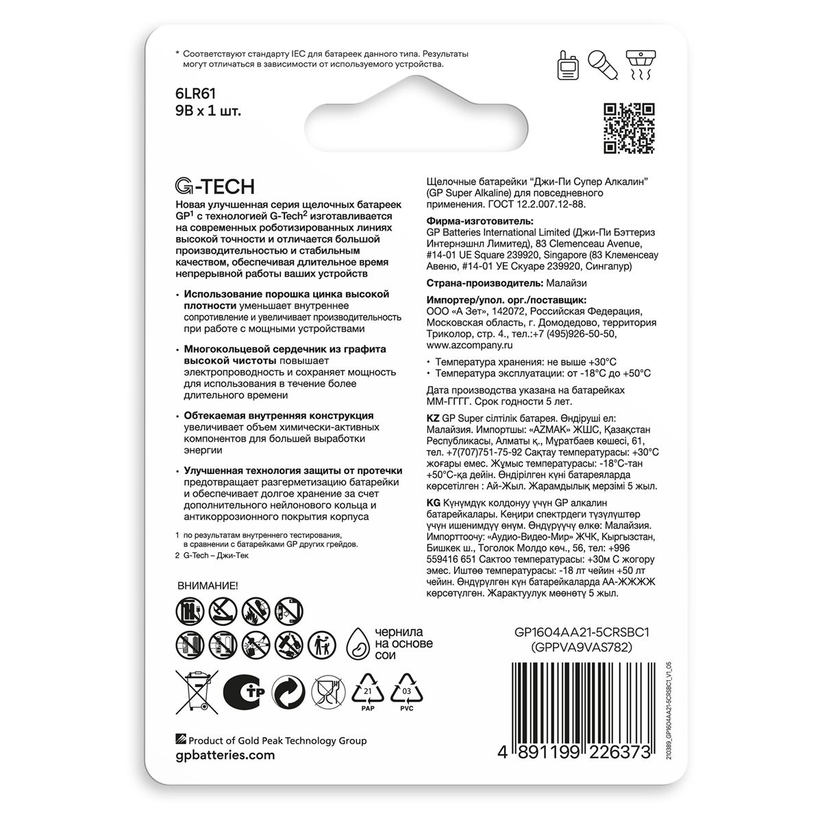 Батарейка GP Super G-Tech MN1604 (6LR61) Крона, алкалиновая, BC1