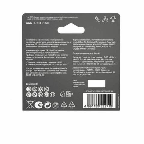 Батарейки КОМПЛЕКТ 8 шт., GP Ultra Plus G-Tech, AAA (LR03), алкалиновые, мизинчиковые, 24AUPA21-2CRB8