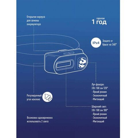 Фонарь налобный аккумуляторный КОСМОС, 3 Вт, LED + 3 Вт, СОВ, Li-ion, заряд от USB, KocH3WDLith