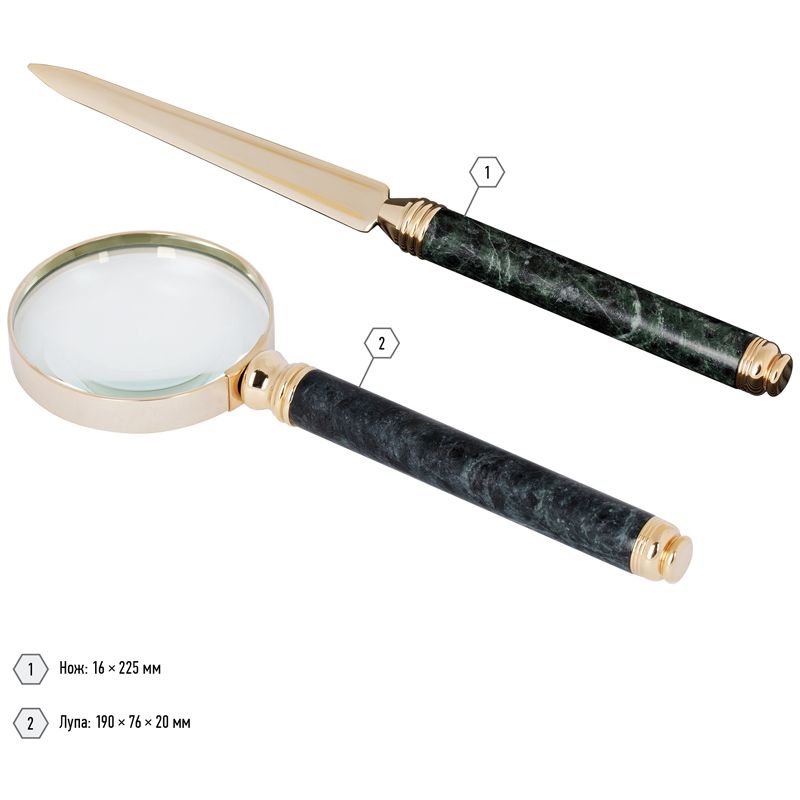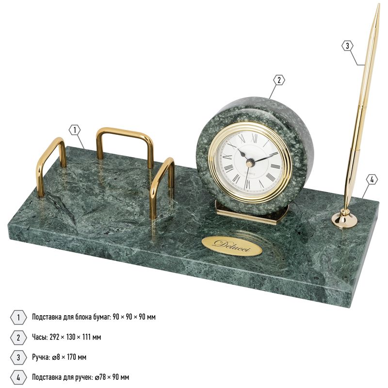 В него входят: стакан для карандашей и ручек (диаметр – 8,5*10 см), лупа (19*7,6*2 см), нож для писем (16*22,5 см) и подставка (29,2*13*11,1 см) под шариковую ручку с часами. Батарейка для часов и шариковая ручка входят в комплект, цвет чернил ручки – синий.