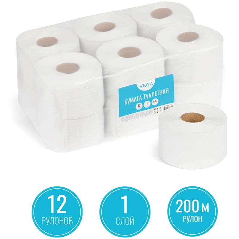 Бумага туалетная Vega Professional, 1-слойная, 200м/рул., цвет натуральный