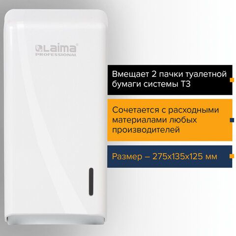Диспенсер для туалетной бумаги листовой LAIMA PROFESSIONAL ORIGINAL (Система T3), белый, ABS-пластик, 605770