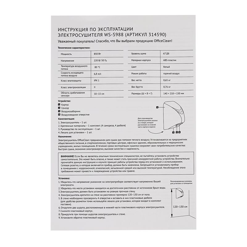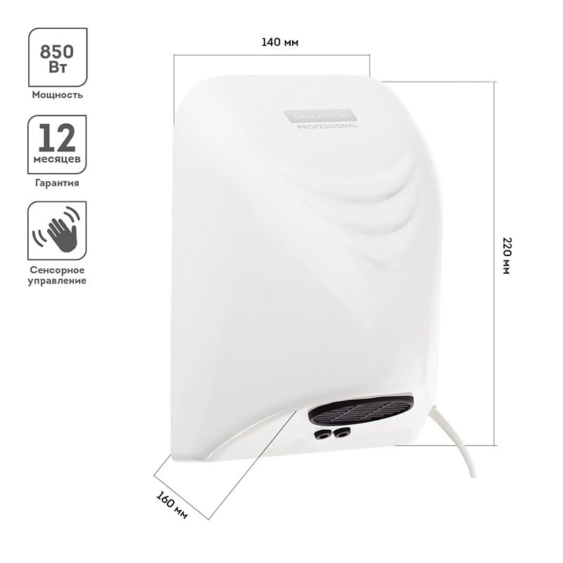 Электросушитель для рук OfficeClean Professional, 850Вт, сенсорный, белый, ABS-пластик
